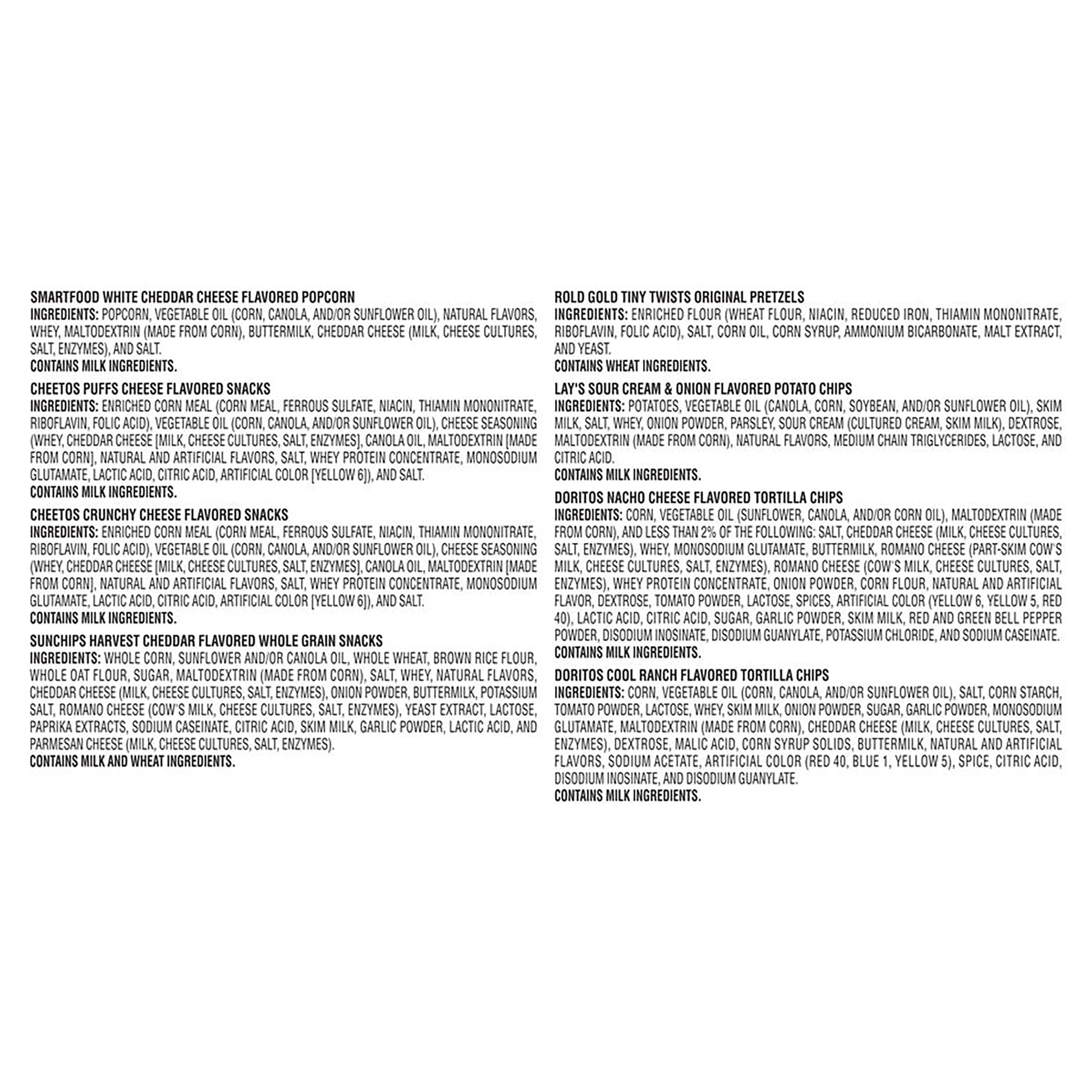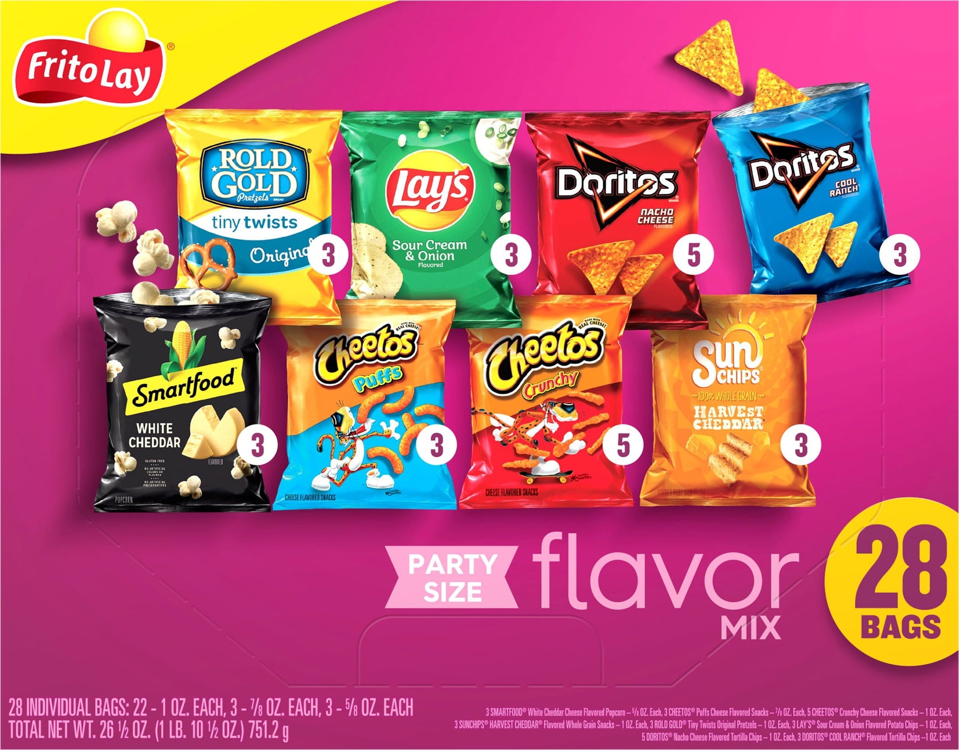 Frito-Lay Flavor Mix Snacks Variety Pack, Party Size, With Frito-Lay Variety Packs, you're ready for snack time any time! Convenient, compact and complete with everyone's favorite brands, Variety Packs are easy to bring along on all your family adventures. If you're celebrating a big win on the soccer field, taking a family road trip, or thinking about an afternoon snack, Frito-Lay Variety Packs have everyone covered. So, whether your family's next adventure is at home or on the go, pack the snack that's got your back!