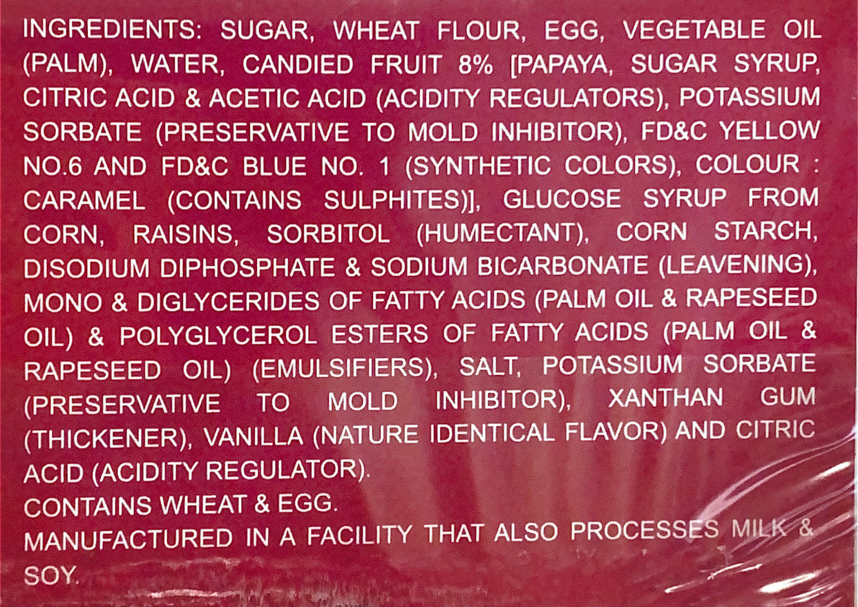 For fruit tarts it is a popular snack item. It is similar to a sponge cake, but has the addition of small jelly-type fruit bits made from papaya. It is a favorite snack of children and adults.