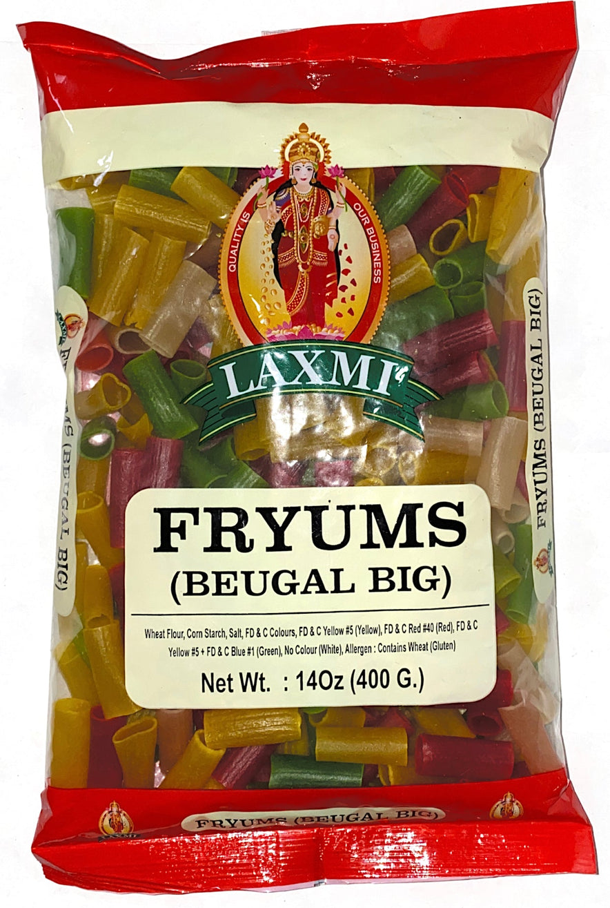 LAXMI Fryums (Beuhal Big) 400g | Far-far (also fryum) is an Indian snack food composed primarily of a cereal based (Maida or wheat flour) 'ready to fry' pellets. Far-far puff up instantly when deep fried, and they are either eaten as a snack or served like a papadum to accompany a meal. It is quite a popular snack in many a Indian homes.