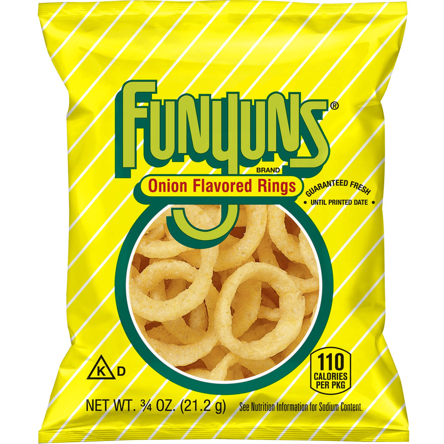 "FUNYUNS Onion Flavored Rings are a deliciously different snack that’s fun to eat, with a crisp texture and zesty onion flavor. Next time you're in the mood for a tasty treat that's out of the ordinary, try FUNYUNS Onion Flavored Rings. Shelf-Stable. Individually packaged,