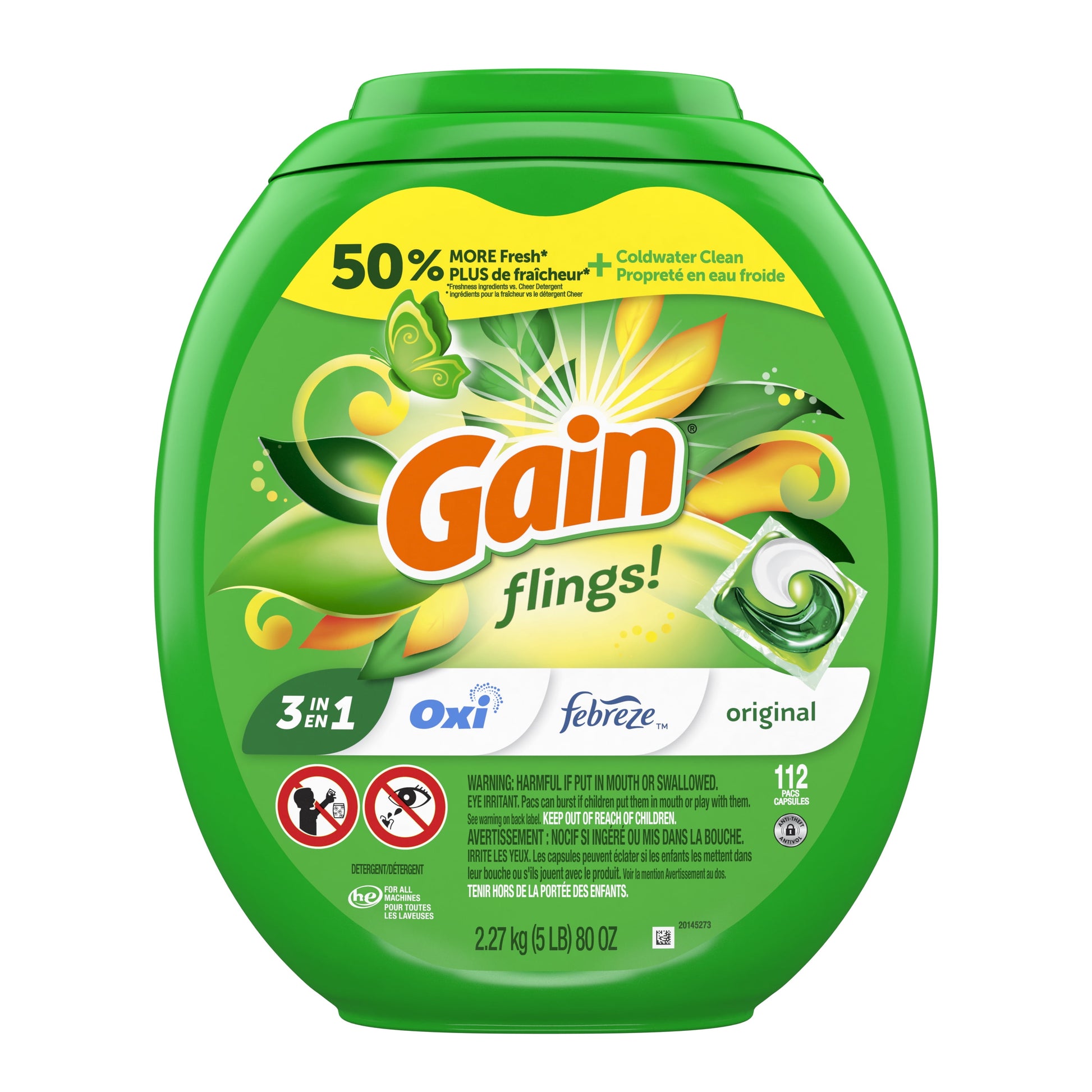 Gain flings! laundry detergent pacs are packed with 50% more scent than Gain liquid laundry detergent. Armed with the stain-fighting power of Oxi and Febreze, they give you nothing but great, clean, amazing-smelling laundry. Use with any laundry set-up, because Gain flings! Pacs dissolve in both hot and cold water and are HE compatible. Gain's refreshing Original Scent infuses your clothes with the fragrance of the green, clean, airy outdoors, so you're always just one quick sniff away from the most invigorating scent experience known to humankind. 112 count.