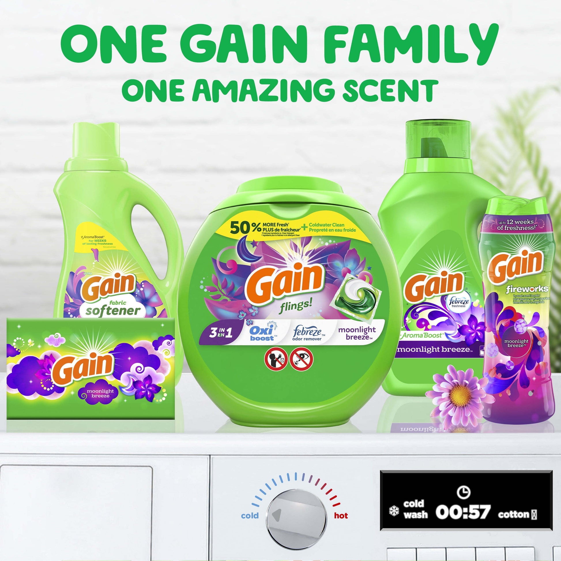 Gain flings! Laundry detergent pods are packed with 50% more scent than Gain liquid laundry detergent. Armed with the stain-fighting power of ox and Febreze, they give you nothing but great, clean, amazing-smelling laundry. Use with any laundry set-up, because Gain flings! Pods dissolve in both hot and cold water and are HE compatible. The light, delightful scent of Moonlight breeze flings will make your nose feel like it's in paradise. Laundry detergents, detergent, laundry, laundry pods, laundry detergents pod, laundry soap, wash detergent, detergent pods. 112 Count.