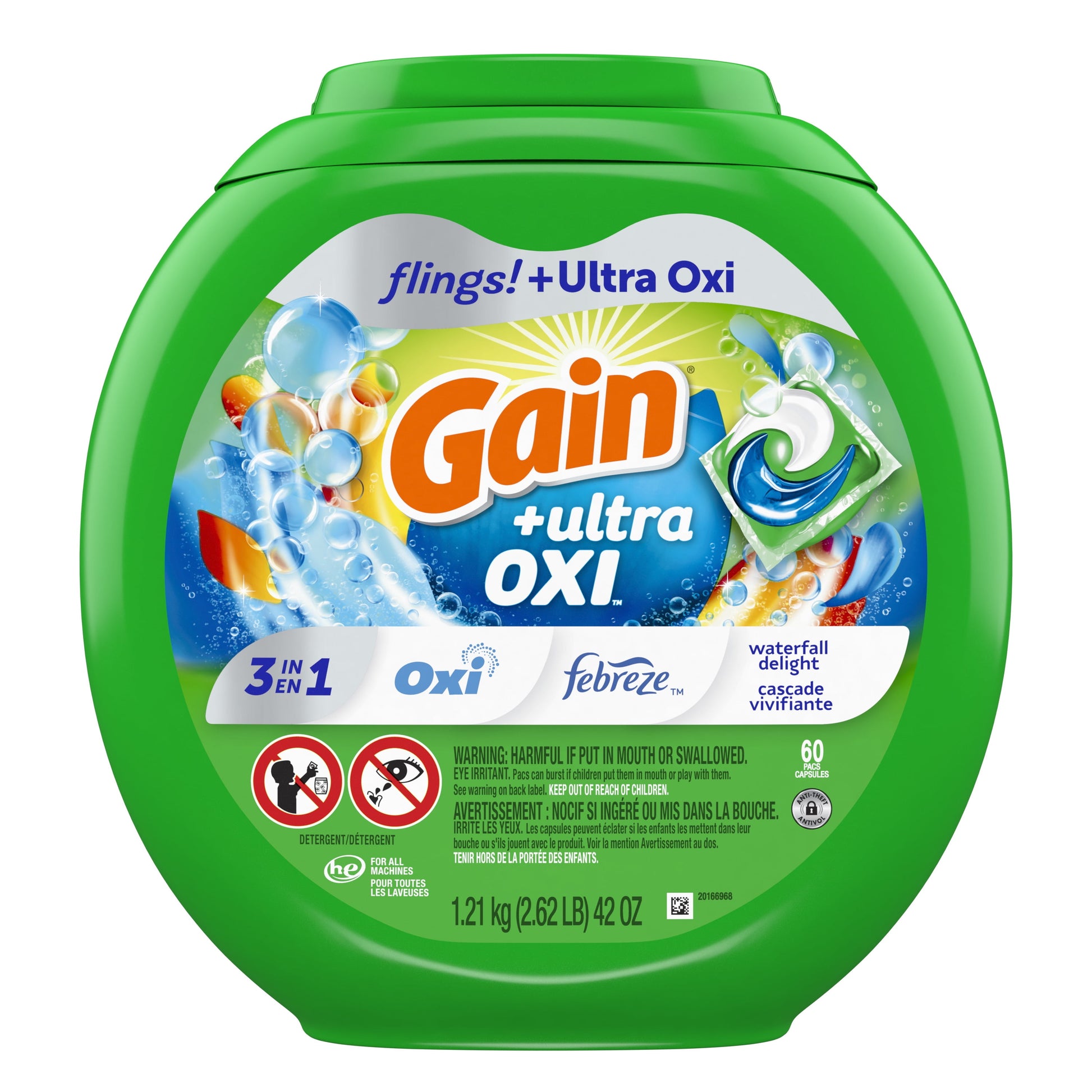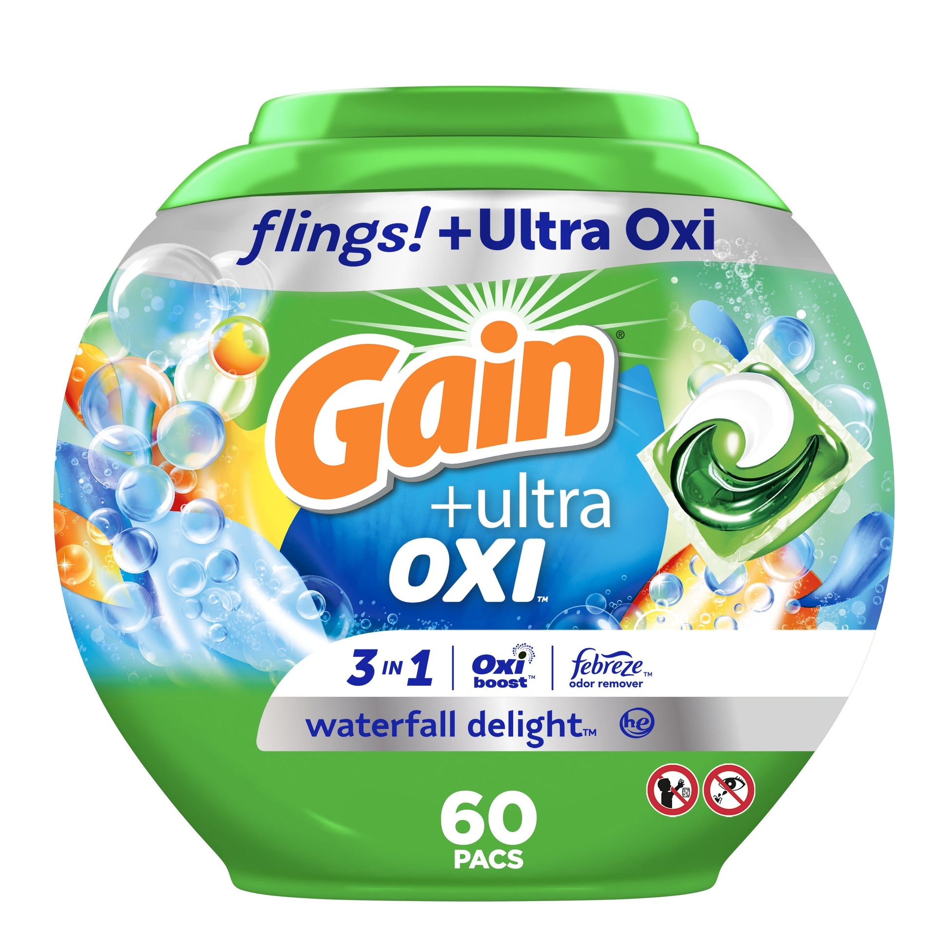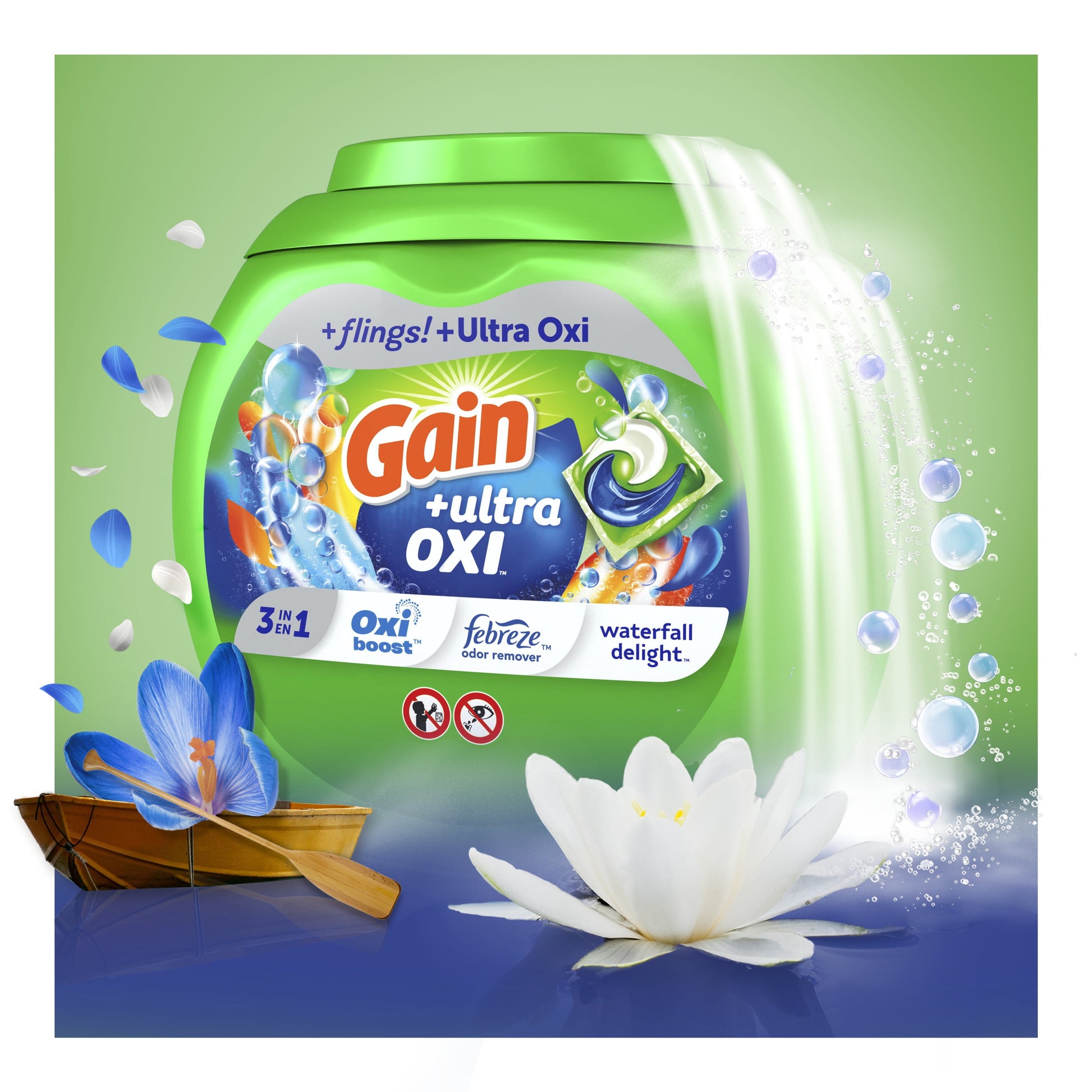 Gain Flings Ultra OXI Laundry Detergent Pacs Waterfall Delight Scent 3-in-1 HE Compatible Laundry Soap is designed with oxi power to lift away stubborn dirt, infusing your clothes with an amazing Gain Waterfall Delight scent that's sure to become one of your favorites. Gain Flings Laundry Detergent is easy to use and even easier on the nose. Fight dirty and smell fresh with a flick of the wrist when you toss a Gain OXI flings into the wash. Gain Flings Ultra OXI Laundry Detergent Waterfall Delight uses an exclusive 3-in-1 formulation of OXI Boost, Febreze, and Waterfall Delight scent to give you a freshness that's sure to become a household favorite. Experience for yourself the crisp, waterfall-freshness clean of Gain Flings Ultra OXI Laundry Detergent Waterfall Delight today. 60 Ct.
