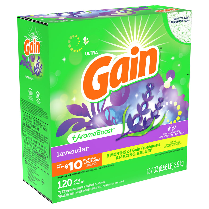 Gain Powder Laundry Detergent in Spring Lavender Scent. For more of the floral scent you love, try adding Gain Fireworks and Gain Fabric Softener to your wash. 137 oz, 120 loads.