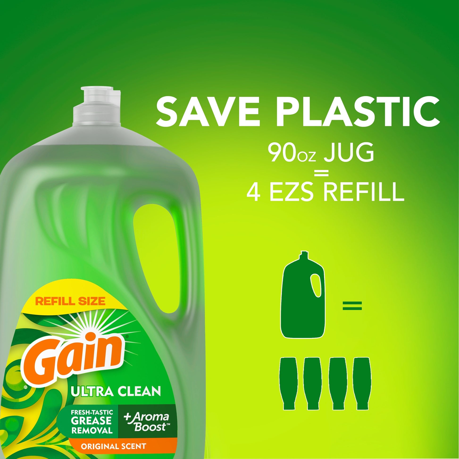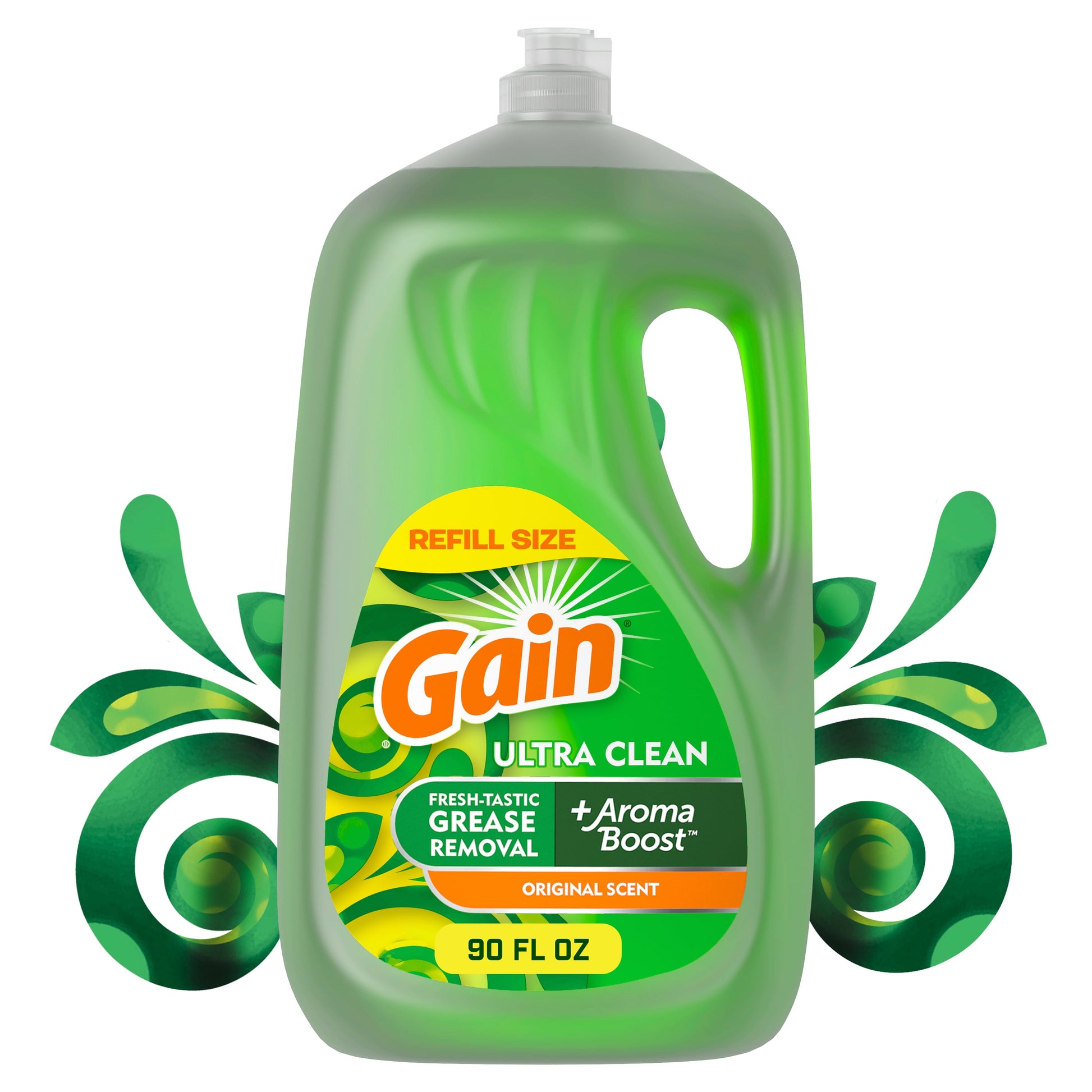 At last the irresistible scent of Gain comes to dishwashing. For a fantastic clean with a great scent experience, try Gain Ultra dishwashing liquid dish soap. 2X more grease cleaning power (cleaning ingredients per drop vs. Dawn Non Concentrated). Gain Original Scent. 90.00 fl oz.