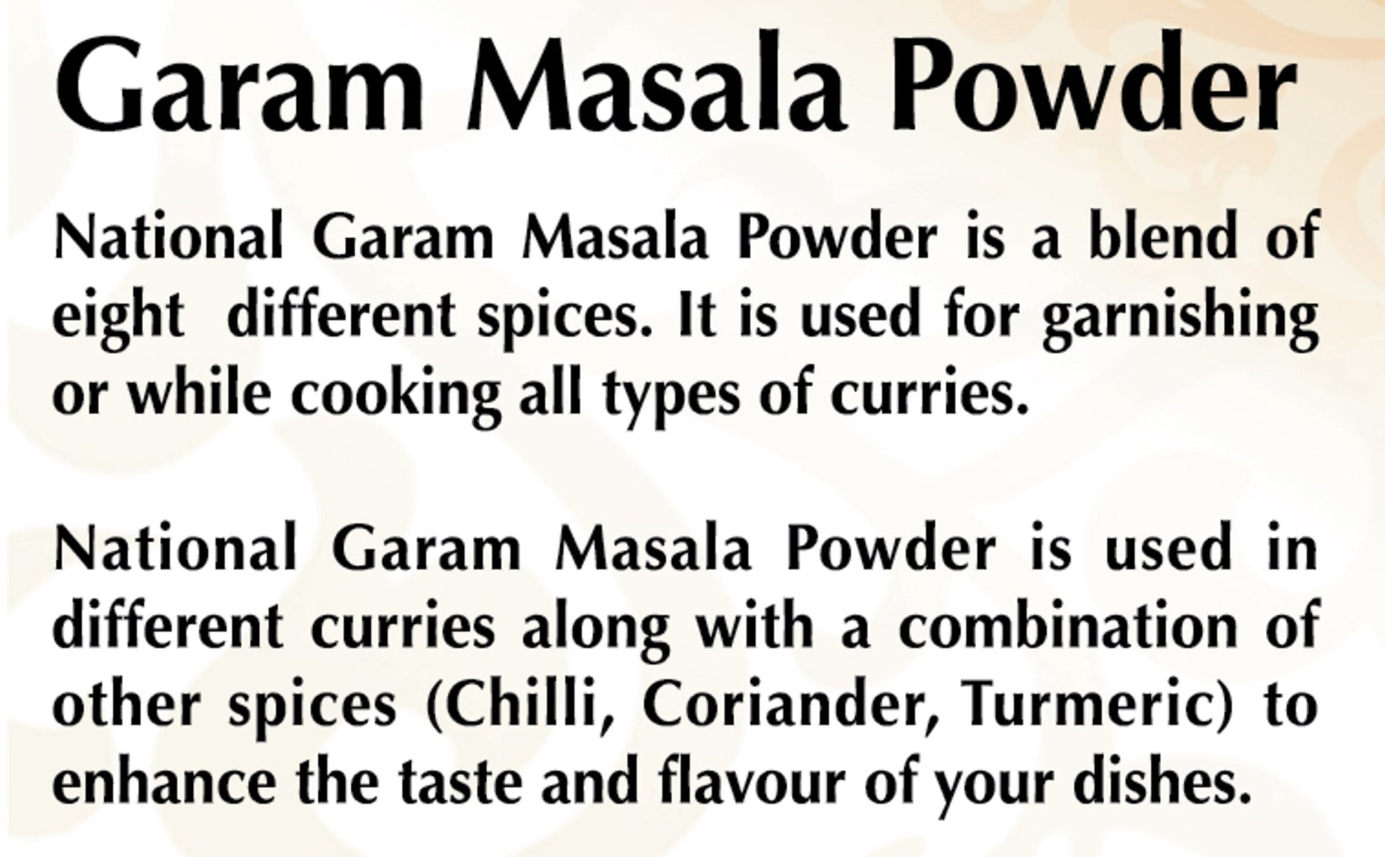 National Garam Masala, is a traditional blend of exotic hot spices. National Garam Masala 50g comes packaged in a bag and sealed in a box. National Garam Masala is a traditional blend of 8 different spices, including Cinnamon, Cloves, Black Pepper and Cardamom. This blend gives the perfect taste and aroma to your food.