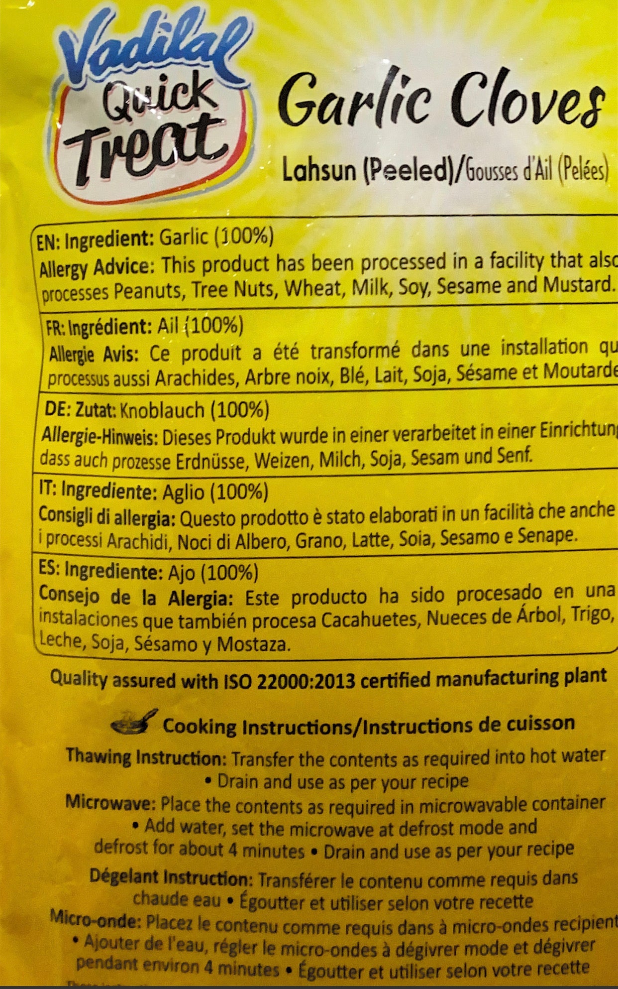 Swadhika foods exports premium quality frozen IQF peeled/chopped garlic and it is produced through the following process under hygienic condition. The fresh garlics pods are mechanically sorted, graded, peeled, manually chopped, blanched, dewatered and frozen using IQF. The frozen products are put through a sieve, inspected, packed and fed through a metal detector.