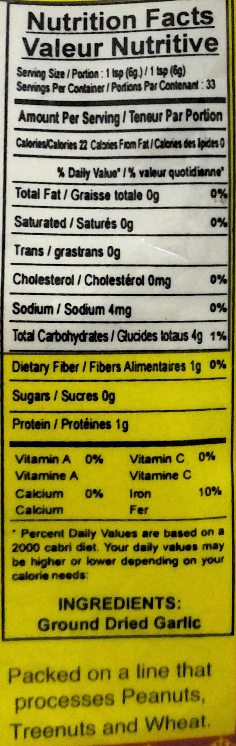 This bitter and pungent spice is used in dishes throughout the world. This powder is a great substitute when fresh garlic is unavailable. It can ease digestion, lower cholesterol, promote high metabolism, flush toxins, and help relieve acme, ear aches and asthma. This is a coarse variety, ground from fresh garlic flakes.
