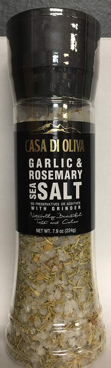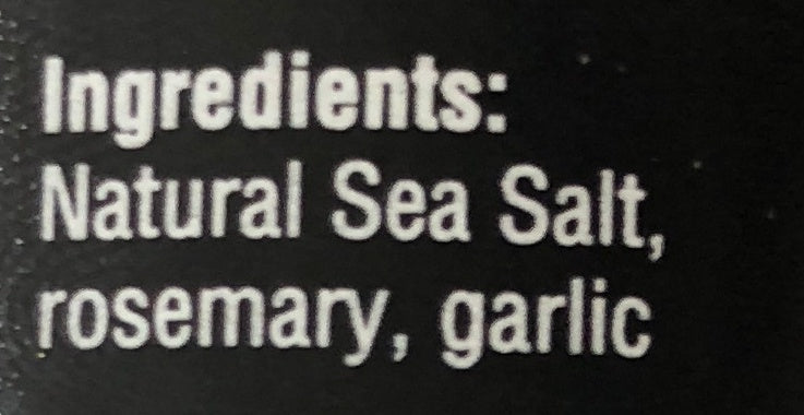 7.9 oz. plastic bottle with built in grinder. naturally beautiful taste and color. no preservatives or additives. kosher. ingredients: natural sea salt, rosemary, garlic.