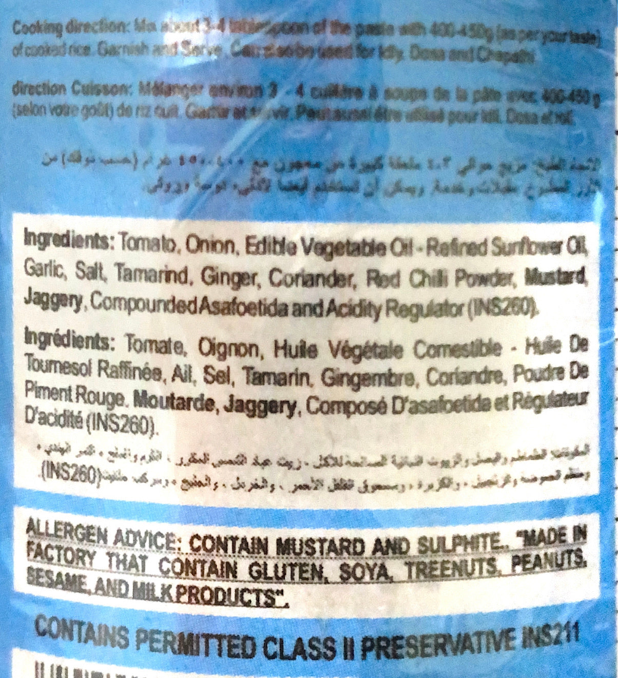 Tomato, onion, edible vegetable oil, garlic, salt, tamarind, ginger, coriander, red chili powder, mustard, cane sugar, asafoetida, acidity regulator E-260.