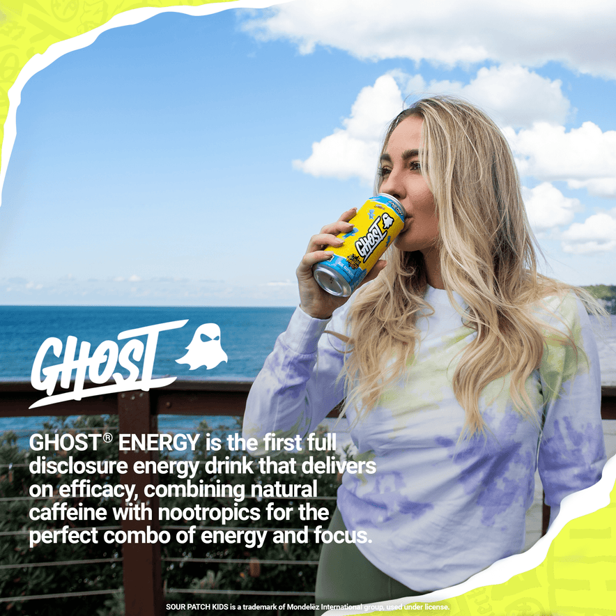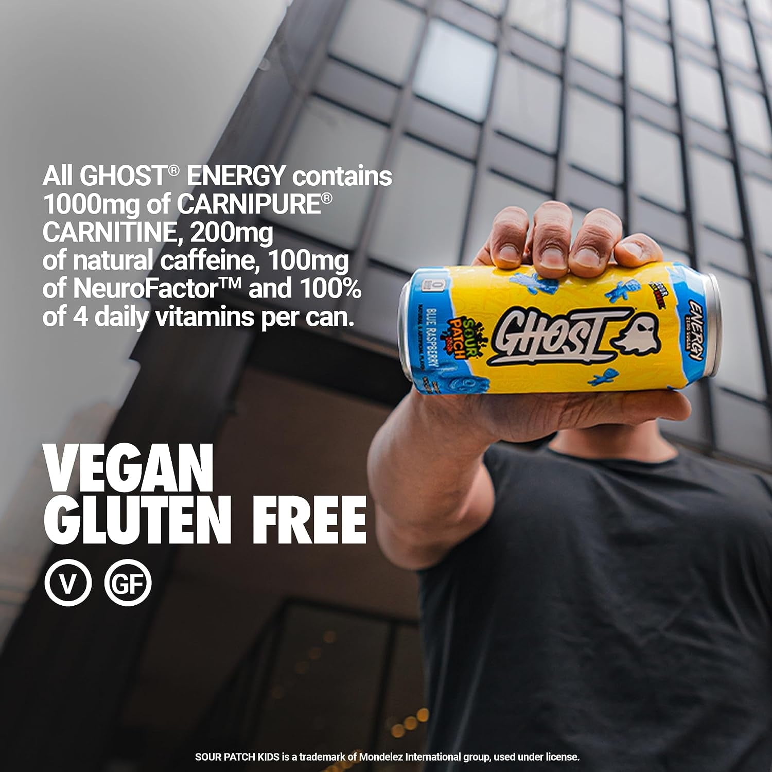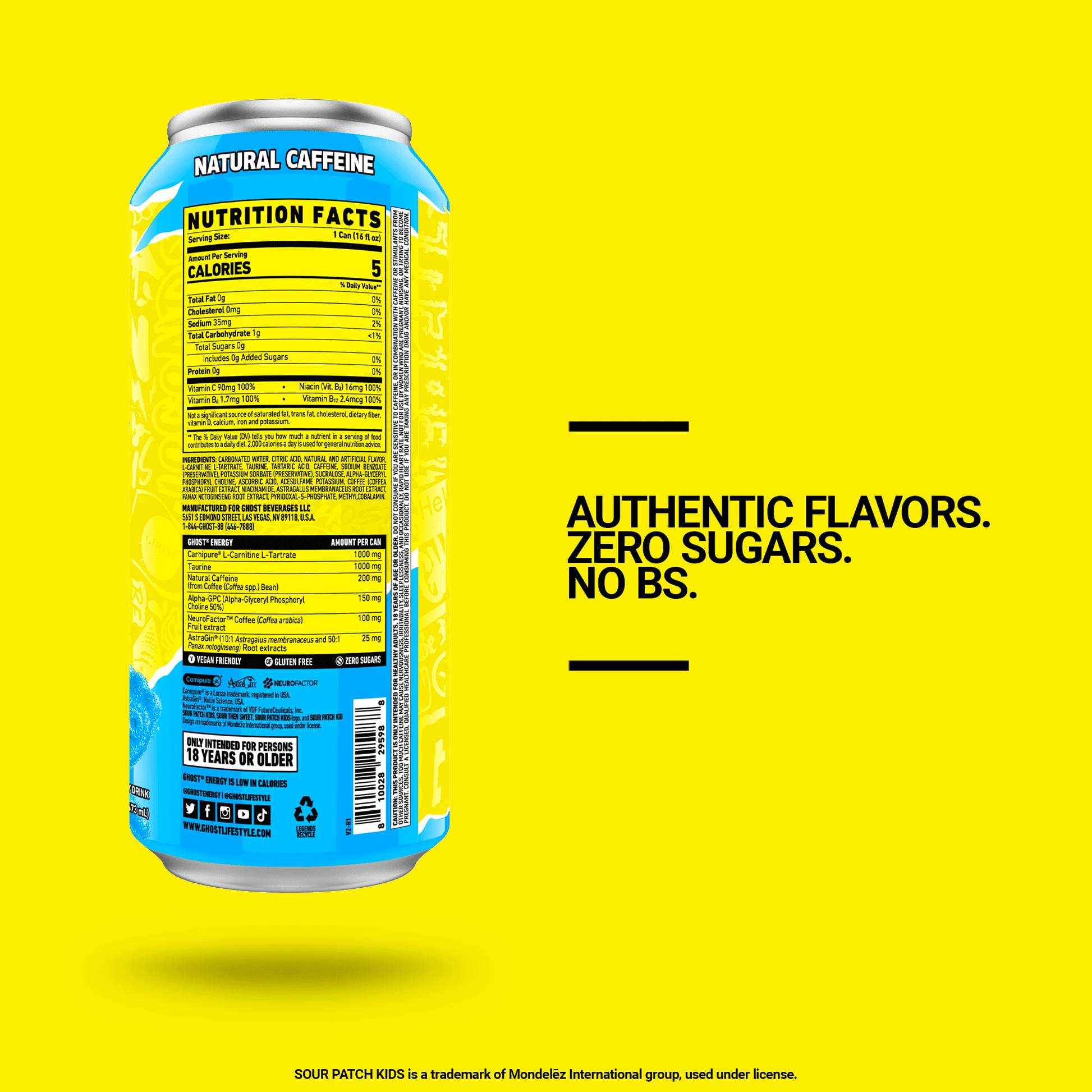 GHOST® ENERGY is the fully transparent, fully loaded energy drink we’ve all been waiting for. Our legendary energy drink features no sugar, no artificial colors, and authentic SOUR PATCH KIDS® Blue Raspeberry flavor. It contains 200mg of Natural Caffeine from coffee beans, which has been found anecdotally to deliver a smooth, feel-good energy with less jitters and no crash when compared to other forms of caffeine. GHOST® ENERGY also combines the nootropics of Carnipure L-Carnitine, Alpha-GPC, Neurofactor, and AstraGin to help your body convert fatty acids into energy, support brain and cognitive function, and absorb a wide range of nutrients.*
