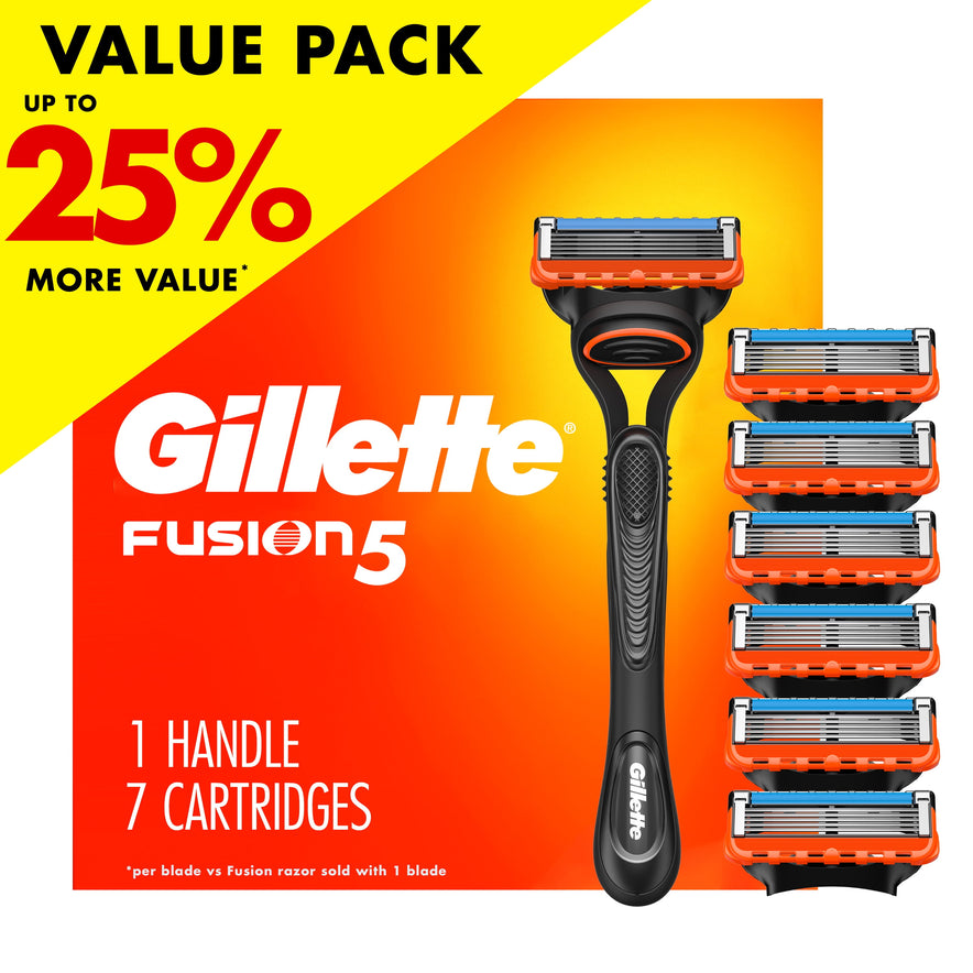 Get a closer*, long-lasting shave with the Gillette Fusion5 men's razor. Gillette's Fusion5 razors are designed to provide the comfort of five blades, and the precision of one. Featuring a revamped razor handle to give you control, five sharp anti-friction blades for a shave you can barely feel, and a precision trimmer that makes shaving hard-to-reach areas such as under the nose and the sideburns easy. Equipped with soft micro-fins that gently stretch and smooth your skin to prepare the hairs for a close shave. The simple yet effective blade stabilization maintains optimal blade spacing for comfort while allowing the blades to adjust to the contours of your face. The larger* lubrication strip provides lubrication after the blades and gives a smooth glide while you shave. Concerned your Gillette handle won't fit? All Fusion5 blades fit all Gillette 5-blade razor handles. Engineered for durability, each refill lasts up to 18 shaves, giving you the ability to customize your shave and get the most out of every blade. Pairs perfectly with Gillette’s PRO Shaving Gel for added protection from shaving irritation (*Vs Mach3)