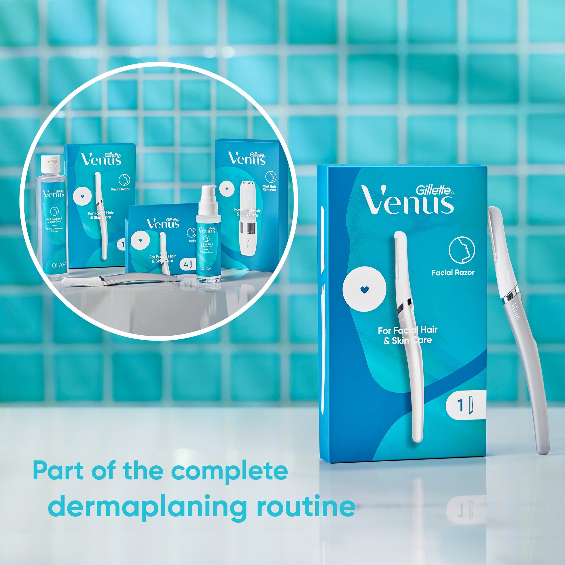 Say "buh-bye" to any unwanted face hairs and "hello" smooth glowing skin with the Venus for Facial Hair & Skin Care Derma-planing Face Razor. Our starter kit comes with 1 refillable premium handle and 2 razor blades, so you can get spa-like smooth glowing skin from the comfort of home. Designed to remove fine hair, dead skin cells, dirt, and oil for an instant glow with results you can see and feel. This dermatologist-tested facial razor is easy to use & effective. Whether you're a first-timer or a pro, these razor blades have you covered: They are designed to respect your skin, featuring our Skin Defense Guard and a protective rounded tip to help protect skin from shave irritation, nicks, and cuts. The durable, high-quality, weighted handle helps you achieve comfort and control as you smooth and exfoliate with the derma-planing razor. Forget about those disposable derma-planers: Our Venus face shaver handle is totally reusable. Simply remove your used blade and easily click in the next one (we recommend swapping out every 3 uses). For an effective shave with less irritation, hold the skin taught with one hand, using the other hand to hold the facial razor at a 45-degree angle-gently move the derma-plane razor in a downward direction. Use Venus complete regimen line of products for facial hair removal for women to set you up for a smooth derma-planing experience in 3 easy steps! Step 1, simply prep and cleanse with our cleansing primer before derma-planing. Step 2, derma-plane for smooth skin. Step 3, apply soothing hydration with our post shave hydration serum.