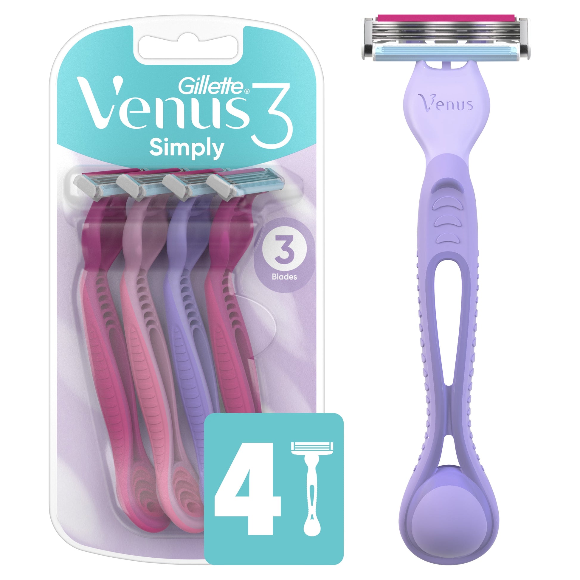 Gillette Venus Simply 3 Colors women's disposable razors provide a close shave at an amazing value. These razors come in multi-colored handles to bring your shave a fun & colorful experience. They feature a 3-bladed pivoting head for hard-to-shave areas with a Lubri-strip for glide. Enjoy a close shave with more comfort (vs. Venus Simply 2). Female, All skin types