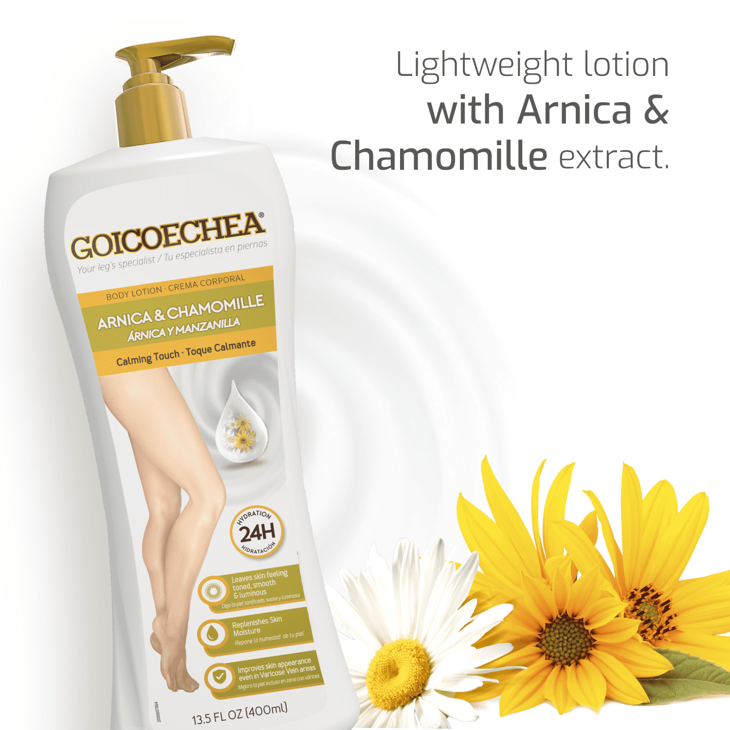 Your busy life and being on your feet all day takes a toll on your legs. Goicoechea Calming Touch Lotion combines arnica and other natural extracts to bring relief to fatigued legs. Specially formulated to treat dry skin on the legs, this Goicoechea cream formula works to relax and refresh with a cooling sensation to nourish and soften the skin. Our gentle yet powerful blend helps relieve pain and soreness from tired, stressed legs. Goicoechea varicose vein cream helps diminish the appearance of varicose veins, improves blood circulation, and promotes smooth, healthy-looking skin. The special blend of arnica flower extract helps soothe skin while toning and rejuvenating tired legs for up to 24 hours of deep hydration. The result is a noticeable reduction in the appearance of unsightly varicose veins. Give your legs a break with Goicoechea Calming Touch Lotion specially formulated for aching and tired legs.