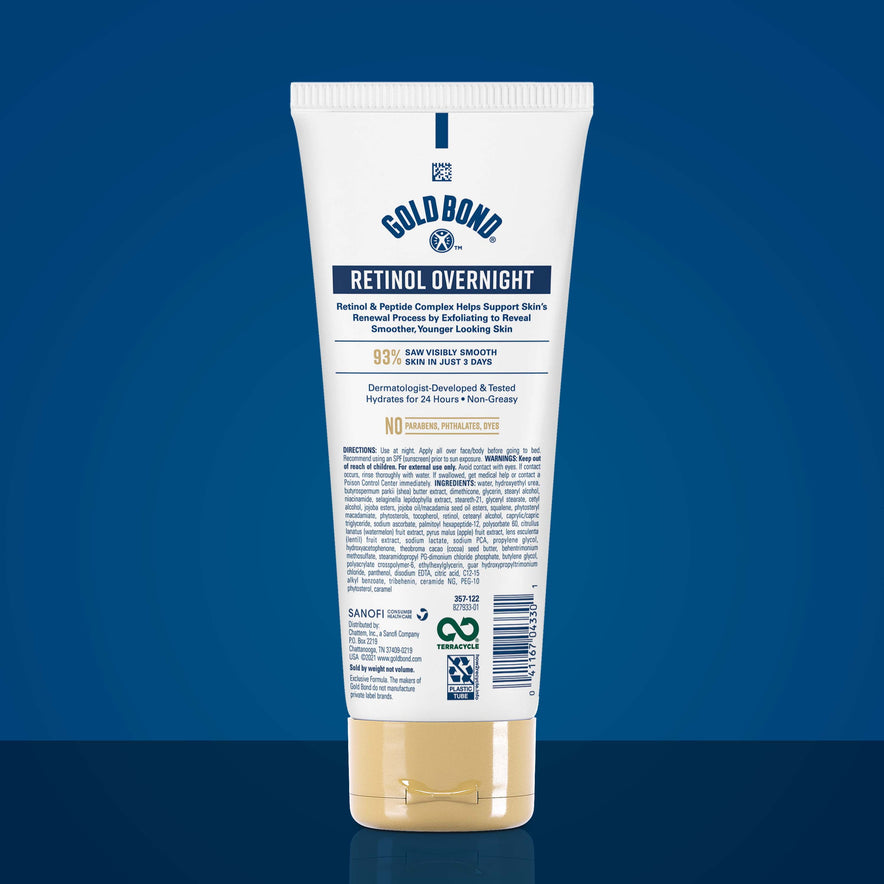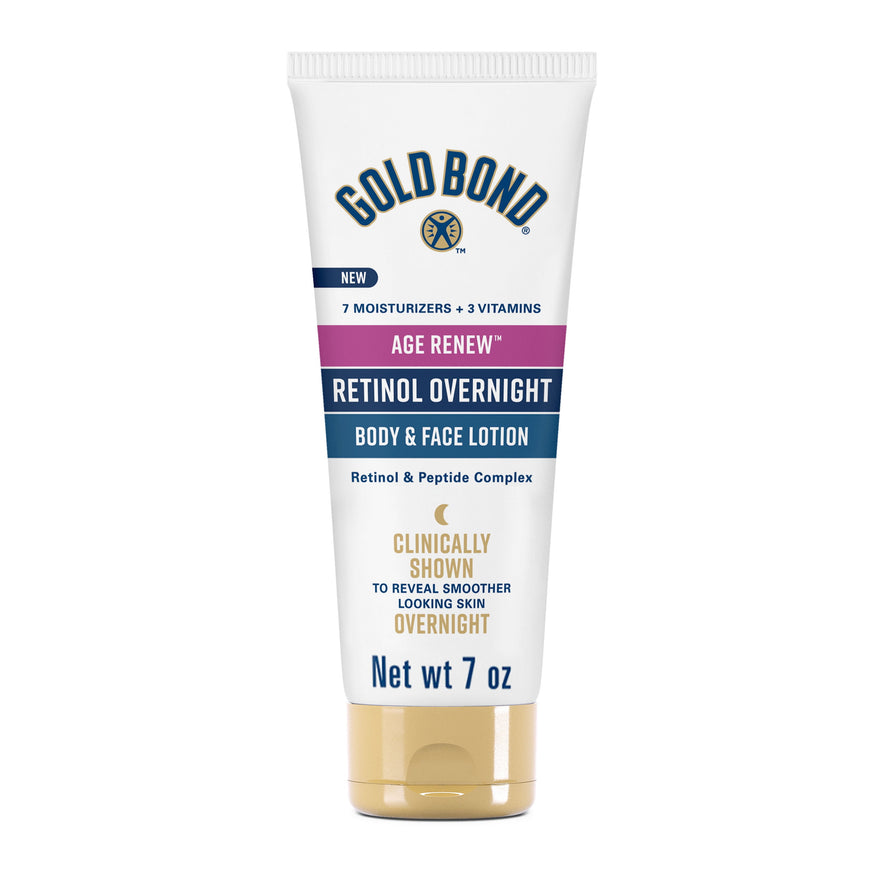 Smoother-looking skin is a sleep away with Gold Bond Age Renew Retinol Overnight Body & Face Lotion. Formulated with retinol, the most clinically tested anti-aging ingredient*, this lotion for mature skin helps visibly improve bounce and elasticity to skin. How it works: Retinol supports skin's collagen to visibly tighten and lift skin for a more youthful appearance. This Gold Bond Age Renew lotion also provides long-lasting hydration with nourishing shea and cocoa butter. The non-drying, non-irritating retinol formula even locks in moisture while you sleep. Best of all, this dermatologist-developed and tested lotion is hypoallergenic and free from parabens, dyes and fragrances. It's suitable for all over the body and face everyday use, when used as directed. Experience visible improvement in fine lines and wrinkles** with Gold Bond Age Renew Retinol Overnight lotion.
