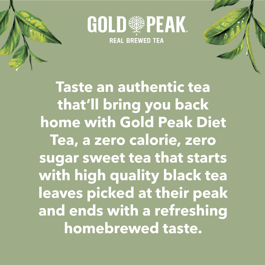 Gold Peak is real brewed tea made from tea leaves picked for peak taste - enjoy the zero-calorie option, Gold Peak Zero Sugar Tea. Tea bursting with refreshingly natural flavors. Perfect for the whole family, these convenient bottles let you take real brewed tea wherever you go.Whether it’s a picnic in the park, watching the game, or a backyard barbeque, get that delicious fresh brewed flavor with every sip. Gold Peak Zero Sugar Tea is a zero-calorie tea that uses pure filtered water for a difference you can taste.Gold Peak has a variety of real brewed flavors that pair marvelously with any occasion, from unplanned get-togethers, to holiday traditions. And the fresh flavor makes any meal feel like home cooking, whether it’s lunch on-the-go or family takeout night, Gold Peak’s real taste will match those real moments.There’s a variety of Gold Peak Teas to choose from, whether you like zero-sugar teas, sweetened real brewed teas or unsweetened real brewed tea options. We have a collection of classic flavors like Gold Peak Lemon Tea, Gold Peak Green Tea and Gold Peak Lemonade Tea and even offer refreshing flavors that are available nationally, like California Raspberry Tea and Georgia Peach Tea.Real Brewed. Real Tea. Real Good.