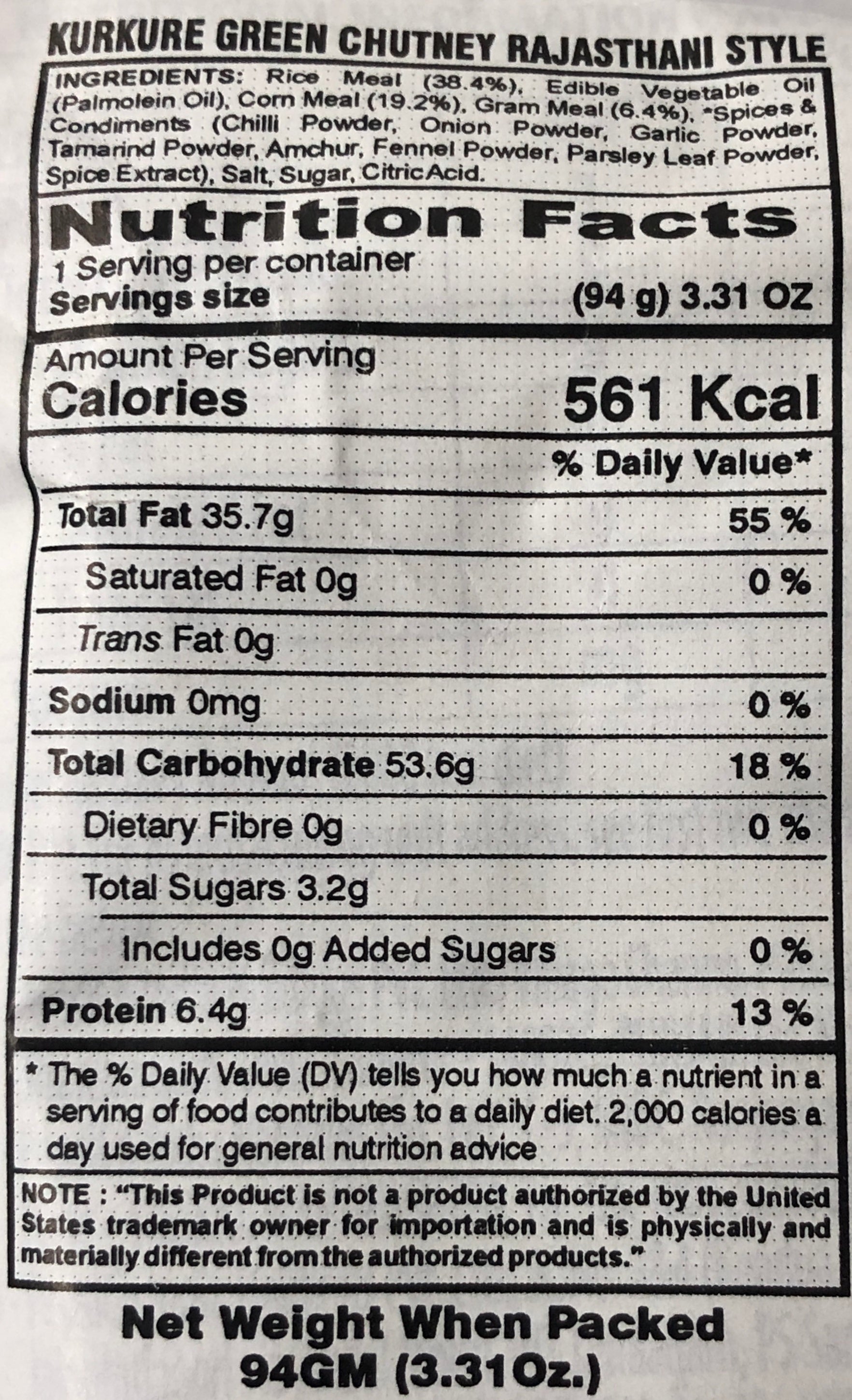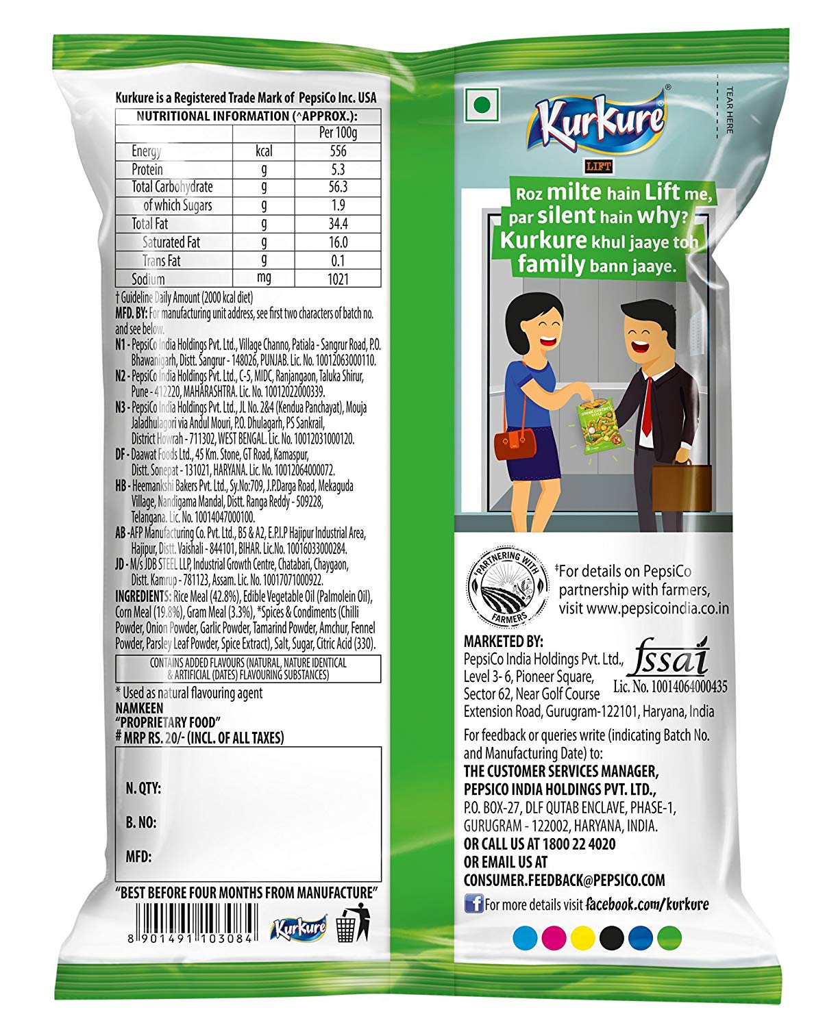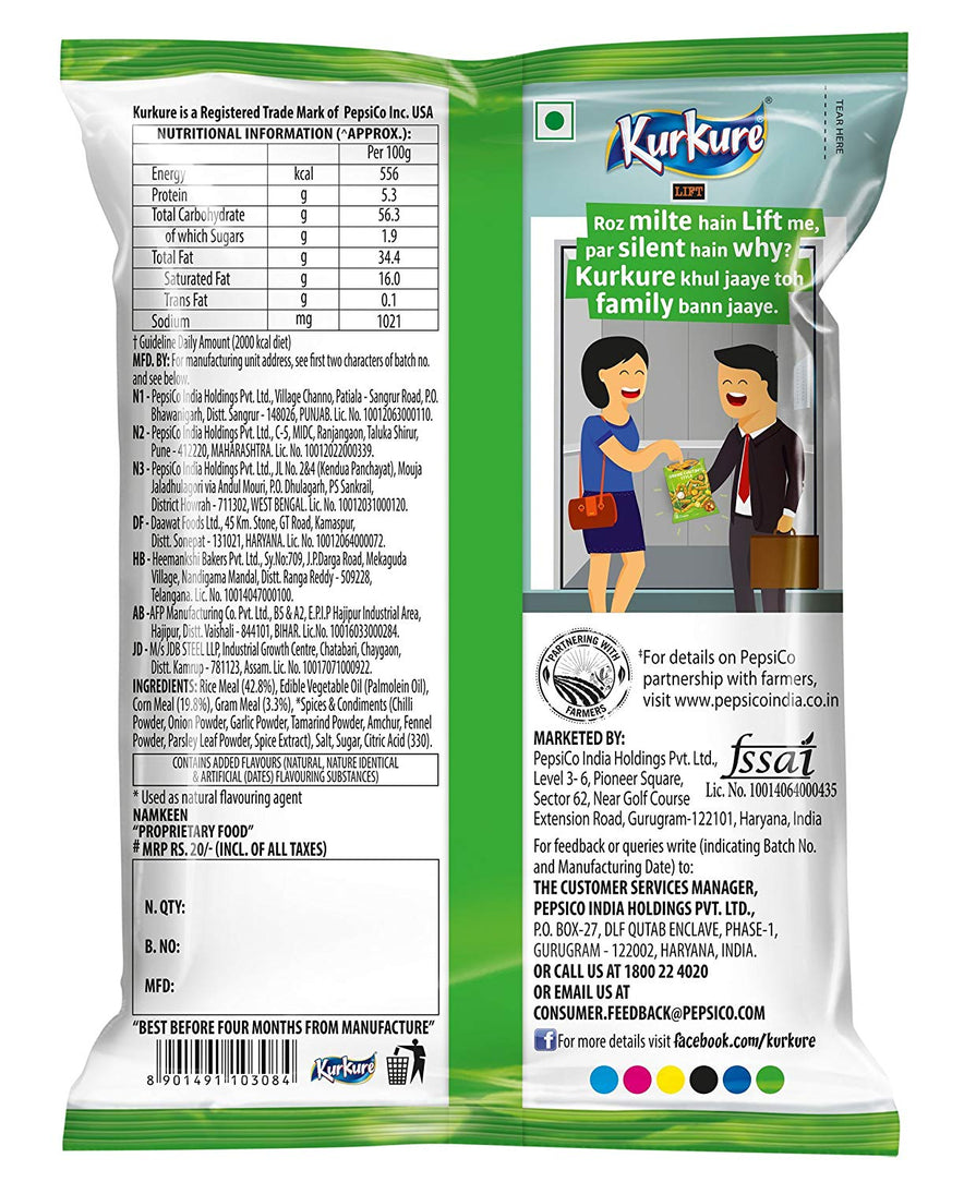 These crunchy snacks are flavored with a spicy green chutney flavor in a North Indian Rajasthani style. About the brand: Kurkure is a crunchy, new-age Pack namkeen snack brand which symbolizes light-hearted fun. Embodying Pack the spirit of India, Kurkure has found a home in millions of hearts and minds and enjoys the position of a strong love mark brand in India. Made with trusted kitchen ingredients: 100 percent vegetarian All the raw materials used in Kurkure comply with The Food Safety and Standards Act and Regulations 2006 and rules that govern the manufacture, distribution and sale of Kurkure.