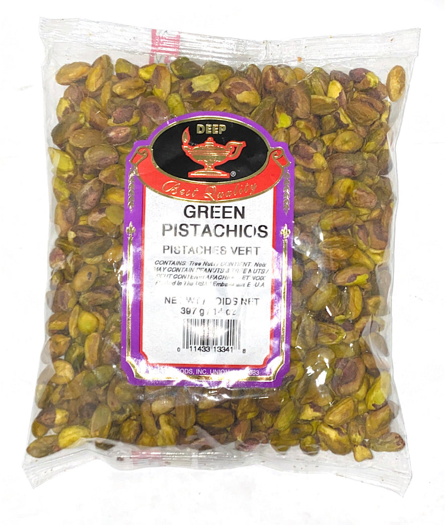DEEP Green Pistachios 14oz.(No Shell)|Pistachios are grown on trees and have naturally tan shells. The kernels inside the shells are a greenish tan. They get their greenish coloring from chlorophyll. Chlorophyll is a natural pigment that gives leaves their green color.