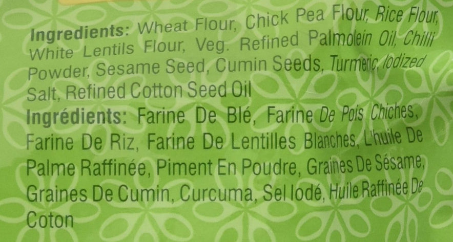 Ingredients: wheat flour, gram flour, rice flour, white lentil flour, veg refined palm oil, chili powder, sesame seeds, cumin seeds, turmeric powder and iodized salt.
