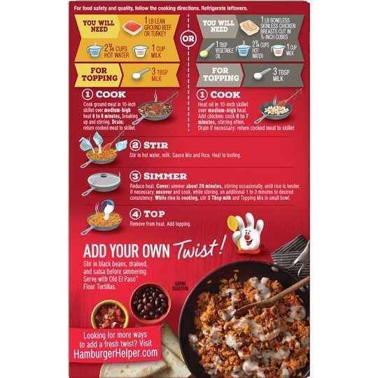 RICE: Enjoy delicious Hamburger Helper Cheesy Enchilada, inspirited by Old El Paso, with a naturally flavored cheese sauce and seasoning mix