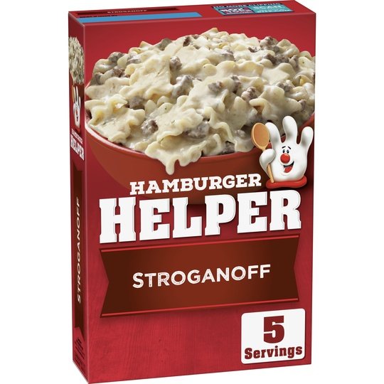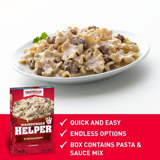 Whip up delicious midweek dinners with Hamburger Helper Stroganoff Creamy Pasta Meal. Hamburger Helper is made with the flavors you love most. Simply add ground beef or cooked frozen meatballs, hot water, and milk to create a creamy, warm weeknight meal option. Our products are made with no artificial flavors. It's delicious comfort food perfect for chilly evenings. Stir in cooked mushrooms and a dollop of sour cream just before serving. Sprinkle with fresh parsley for garnish. Try Hamburger Helper for a delicious, easy family dinner option.Since 1971, Hamburger Helper has extended a helping hand to families converging at the dinner table for a delicious meal option.
