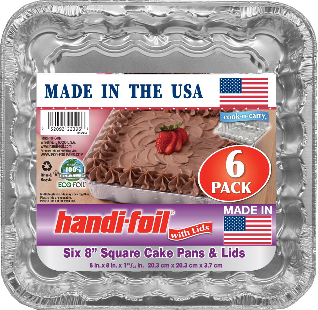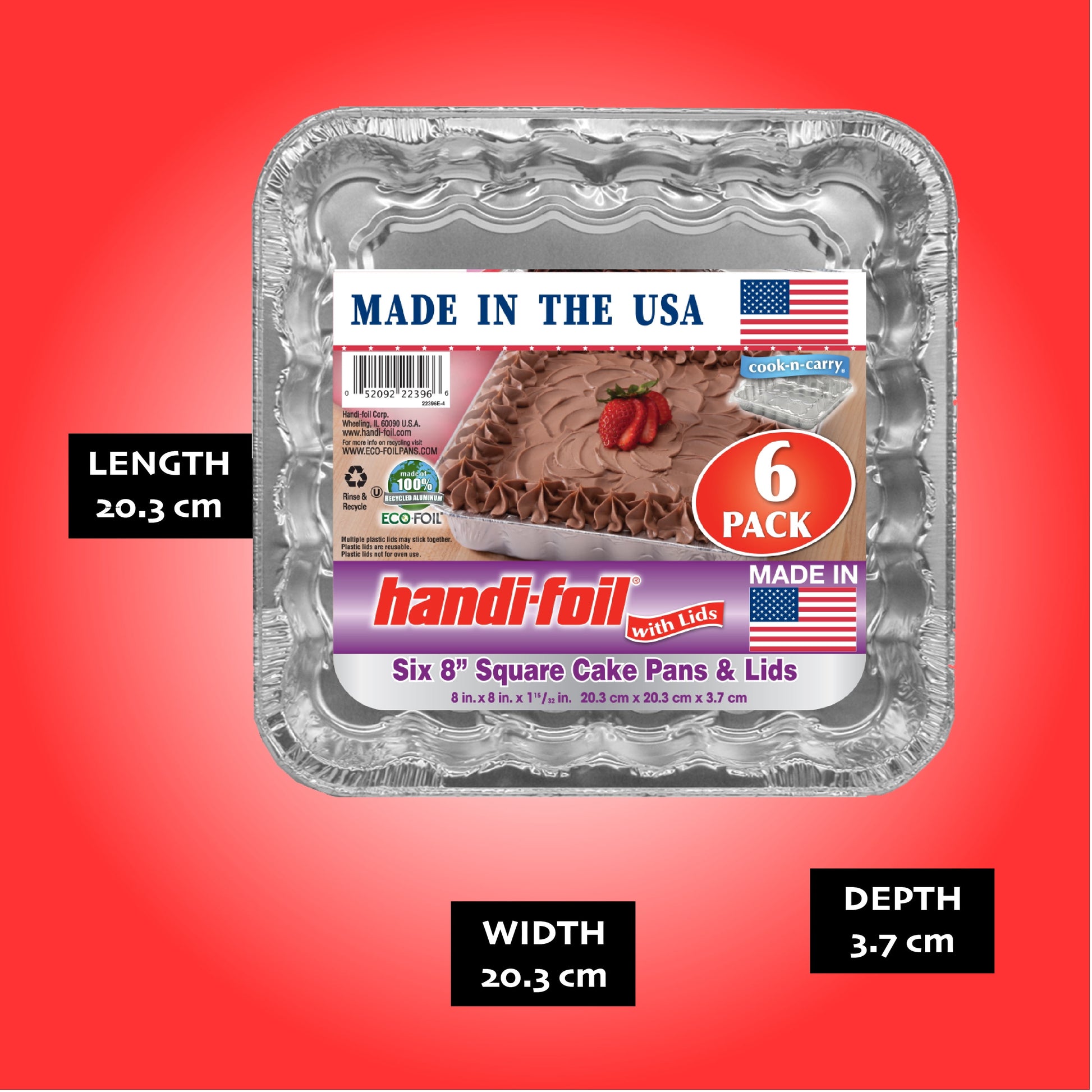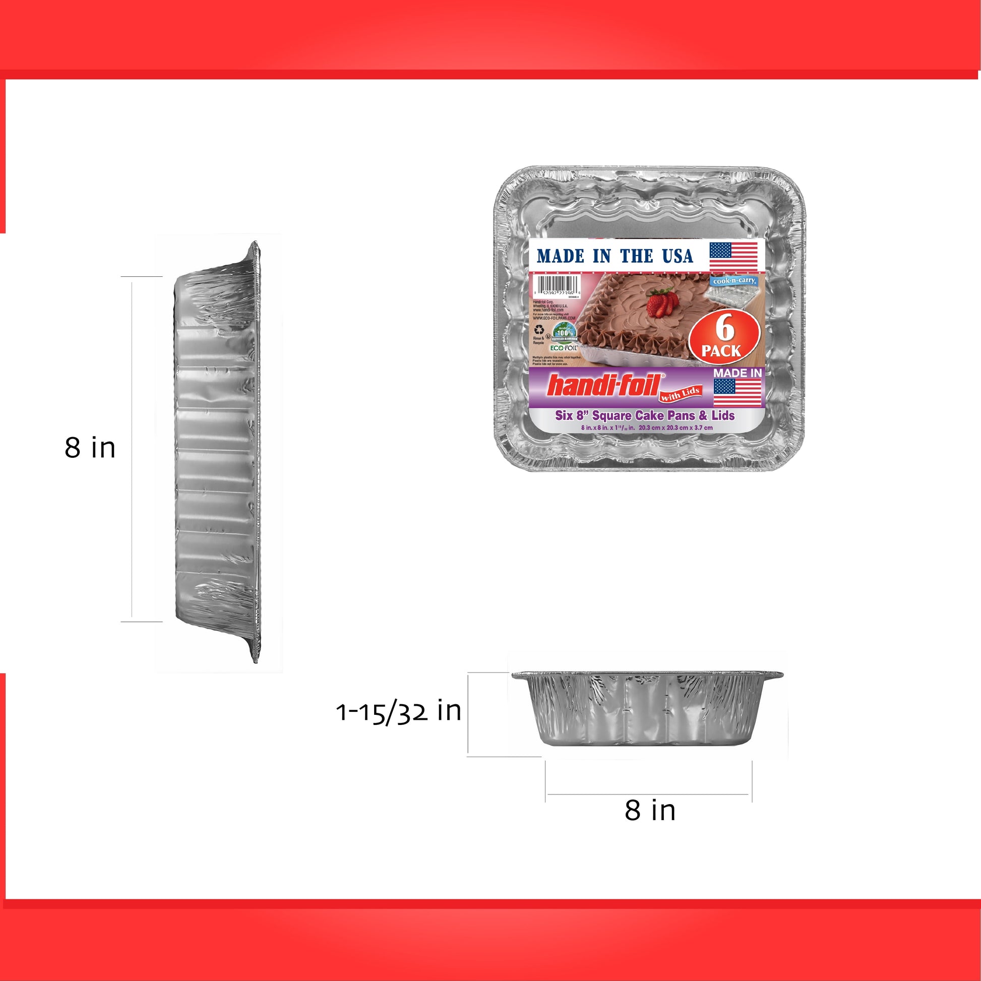 Handi-Foil 8-inch Square Aluminum Cake Pans and Lids include 6 pans and 6 Snap-on lids per package.