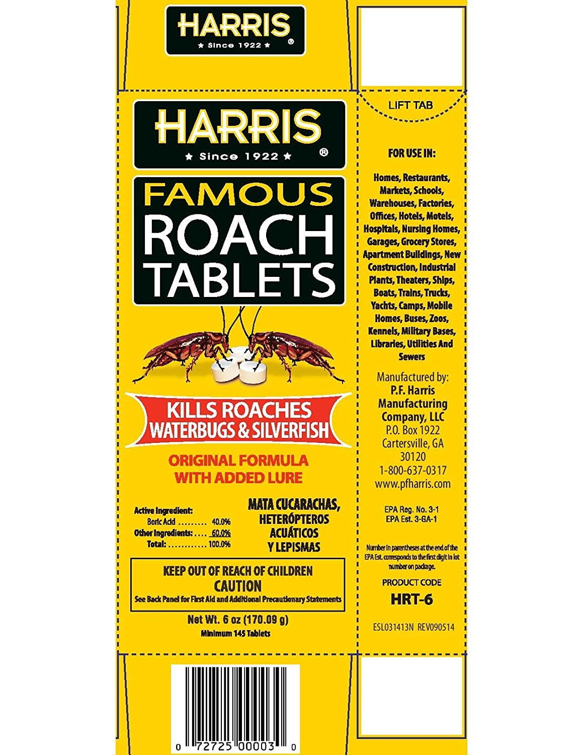 Harris Famous Roach & Silverfish Killer Tablets, 6 oz. uses a boric acid formula with added lure to kill roaches, water bugs & silverfish. One box can treat an entire house, making it one of the most efficient and cost-effective ways to kill a roach. Tablets contain a lure that draws roaches near to feed. Just place tablets in out of the way areas where roaches travel and roaches will find them. Once ingested, roaches die within days. For use indoors in homes, apartments, hotels, restaurants boats, RVs, garages, attics and other locations where cockroaches are found. Always follow label directions and keep out of reach of children.