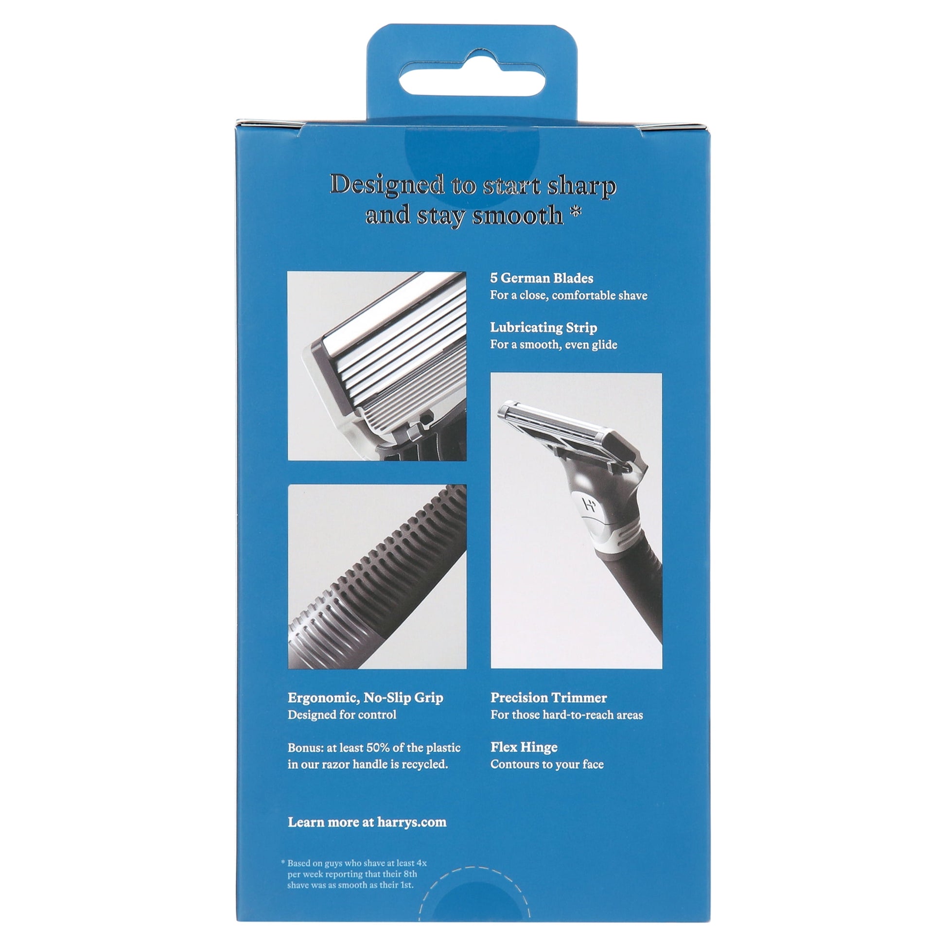 Harry's razors for men have all the features you need for a close shave. Each razor features a 5-blade razor cartridge engineered at the Harry's factory in Germany, which has been manufacturing razor blades for men for over 100 years. The Harry's Truman handle is designed for maximum grip and control with a rubberized matte exterior, textured grip pattern, and weighted core. Harry's razors feature a flex hinge, precision trimmer, and lubricating strip. Guys who shave with these sharp Harry's blades at least four times per week say their eighth shave is as smooth as their first.