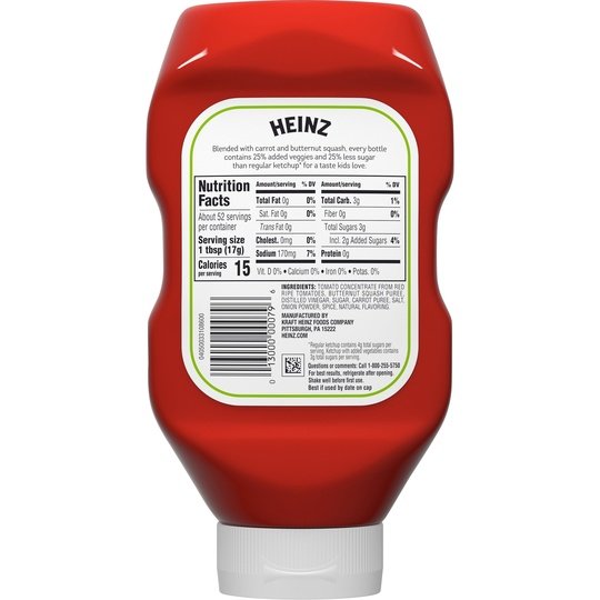 Heinz Tomato Ketchup with a Blend of Veggies is full of real carrots and butternut squash for a refreshing take on everyone's favorite ketchup. Contians 25% added veggies and 25% less sugar than regular ketchup. Taste what makes Heinz Tomato Ketchup with a Blend of Veggies the perfect addition to crispy sweet potato fries or as a dipping sauce your kids will love!