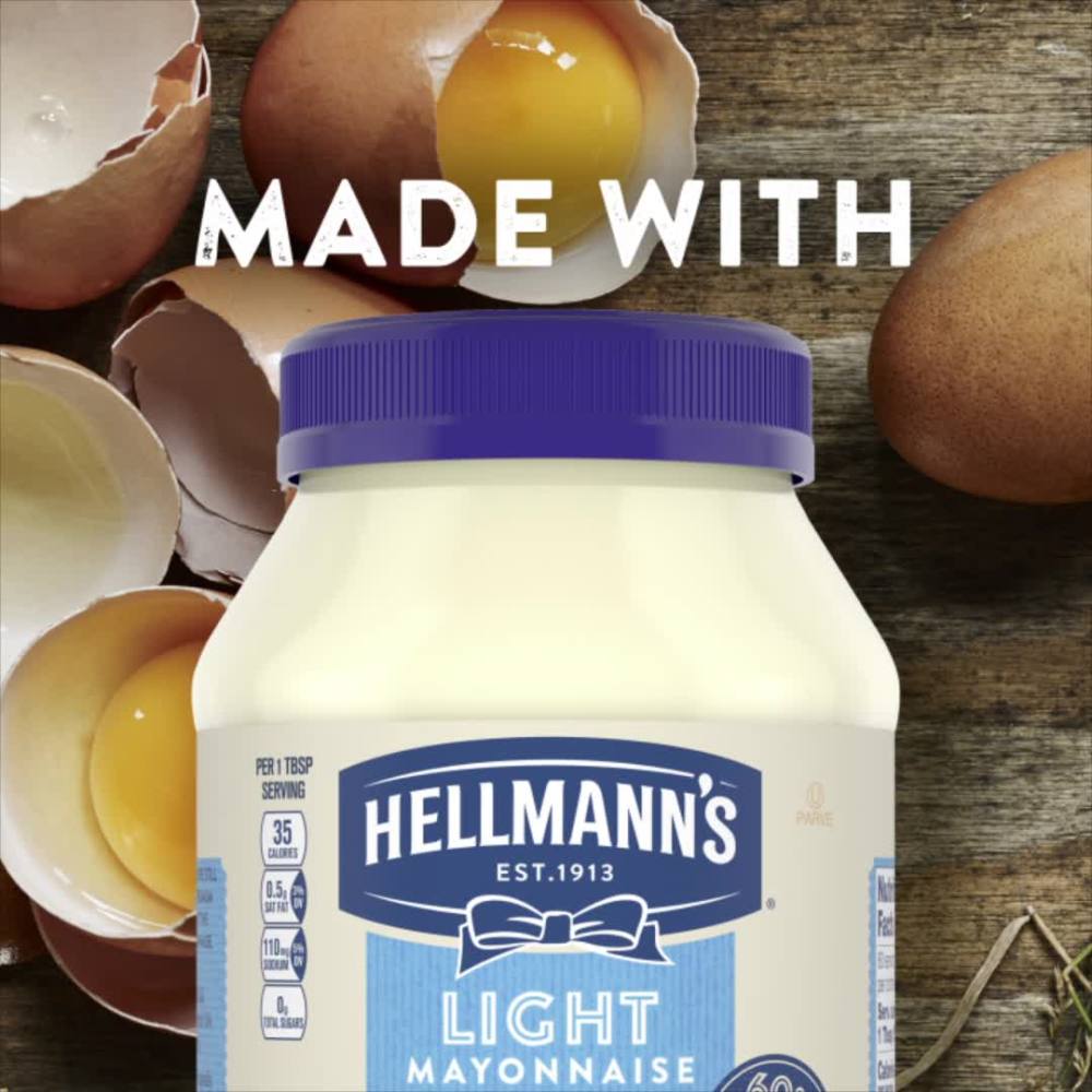 Hellmann's Made with Cage Free Eggs Light Mayonnaise, Enjoy the delicious, light, creamy taste of America's #1 light mayonnaise! Made with 100% cage-free eggs, Hellmann's Light Mayonnaise has only 35 calories per tablespoon and 3.5g of fat per serving -that's 60% less fat and calories but all the rich, creamy flavor of Hellmann's Real Mayonnaise. Our Light Mayonnaise is also a good source of Omega 3-ALA (it contains 230 mg ALA per serving, which is 14% of the 1.6g Daily Value for ALA), and gluten-free and certified kosher. People love the taste of our Light Mayonnaise; it won a national blind taste test of leading brands among people with a preference. We know that to really "Bring Out the Best," we need to do more than just create products that taste good. That's why our delicious Blue Ribbon Quality Mayonnaise is made with quality ingredients, including 100% cage-free eggs* and responsibly sourced soybean oil. Even after 100 years, we're still committed to using premium ingredients to craft the highest quality mayonnaise.