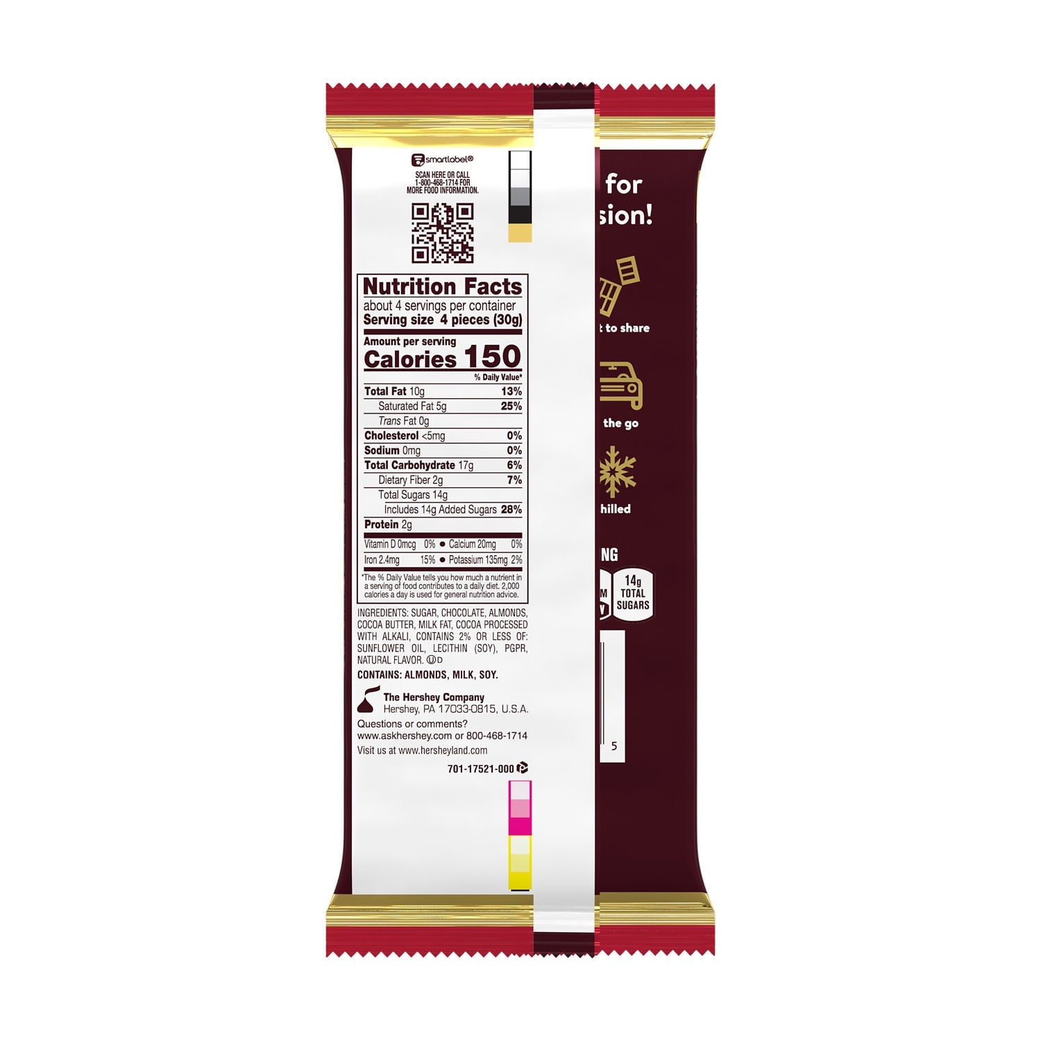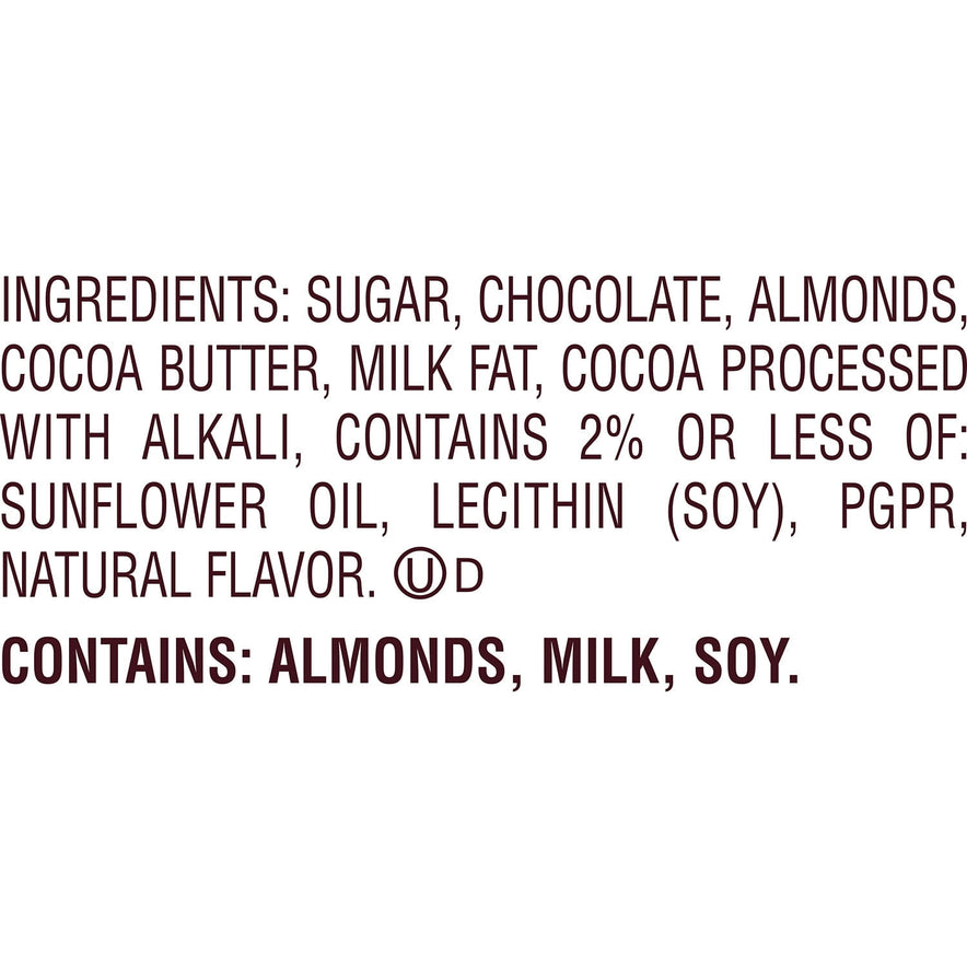 A kosher-certified, 16-piece, extra-large dark chocolate and almond candy bar wrapped for lasting freshness and on-the-go sharing during any adventure