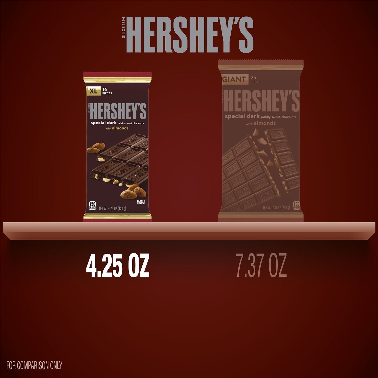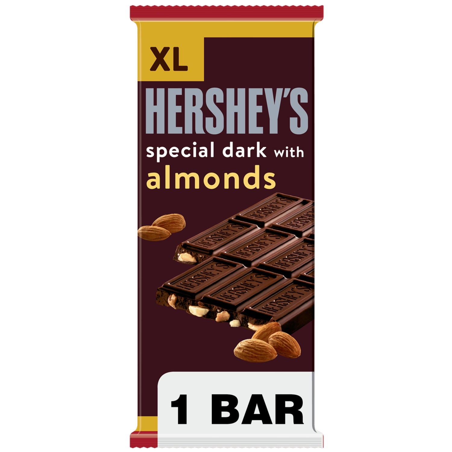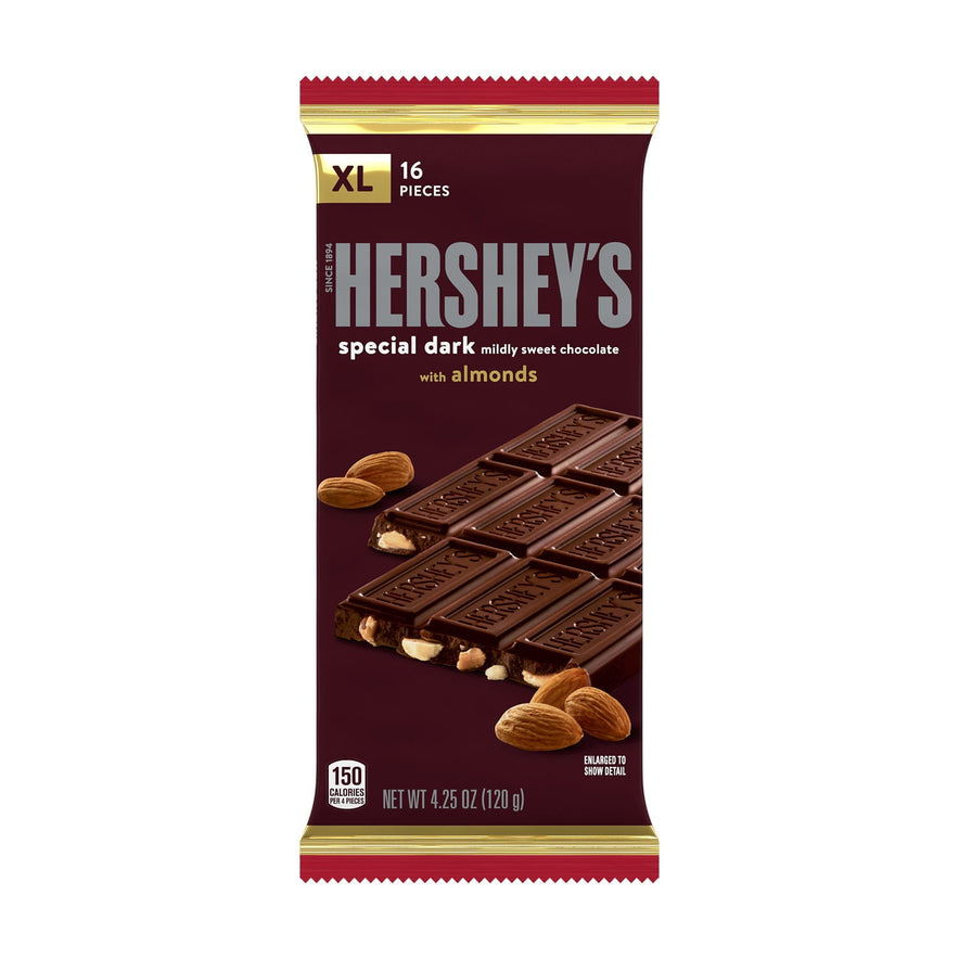 Contains one (1) 4.25-ounce HERSHEY'S SPECIAL DARK Mildly Sweet Chocolate with Almonds XL Candy Bar