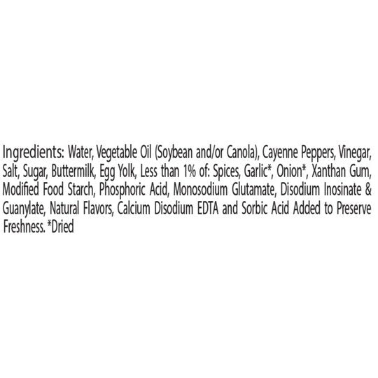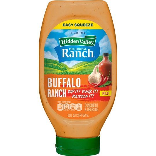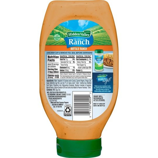 Enjoy the zesty taste of buffalo sauce anytime with Hidden Valley® Buffalo Ranch Dressing and Topping. This zesty buffalo sauce is made with a blend of vinegar, garlic and cayenne red peppers. The squeeze bottle features a flip cap lid that is easy to open and close while delivering a more controlled pour for fewer messes. A great dipping sauce for fried shrimp, chicken tenders or onion rings, it can also be drizzled on veggies or pizza. Or toss with mixed greens, chopped tomatoes and chicken for a quick, easy dinner. Hidden Valley® ranch dressing and topping also makes a delicious addition to sandwiches, tacos and burgers, or as a dip with a vegetable tray or tortilla chips. This gluten free dressing made with real cayenne peppers is as versatile as it is tasty.