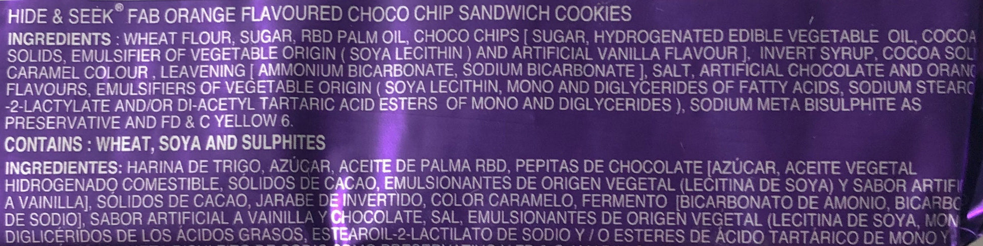 Wheat Flour, Sugar, Edible Vegetable Oil, Chocolate chips (11.8%) [Sugar, Edible Vegetable Fat, Cocoa Solids, Emulsifier (E322 (i)), Artificial flavoring substances (Vanilla)], Invert Sugar Syrup, Cocoa Solids (1.5% ), Raising agent (E503 (ii), E500 (ii)), Salt, Emulsifier (E322 (i), E471, E481 (i)), Dough Conditioner (E223), Natural Color (E150b), Synthetic Food color (E110 ), Artificial flavoring substances (Dark Chocolate, ORANGE)