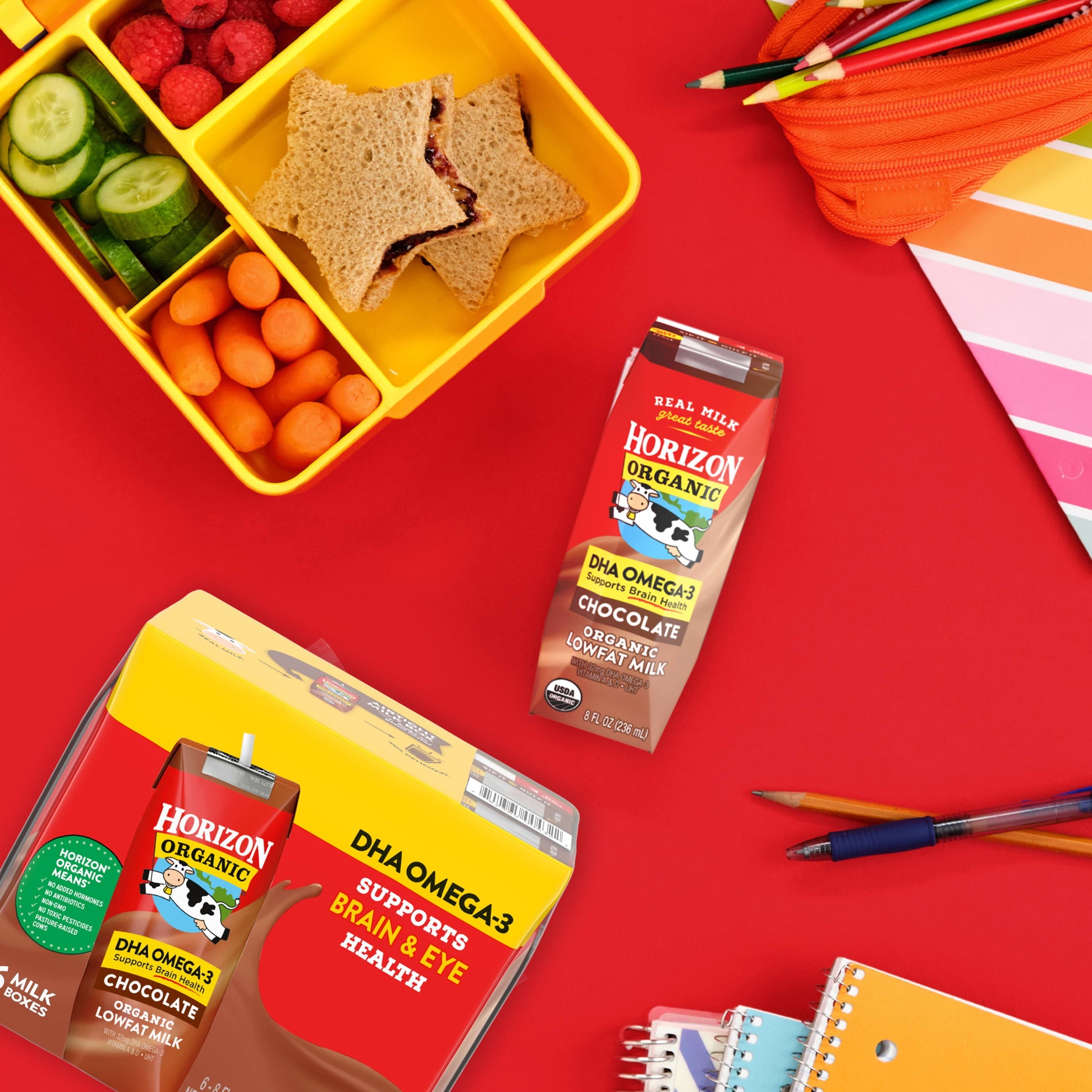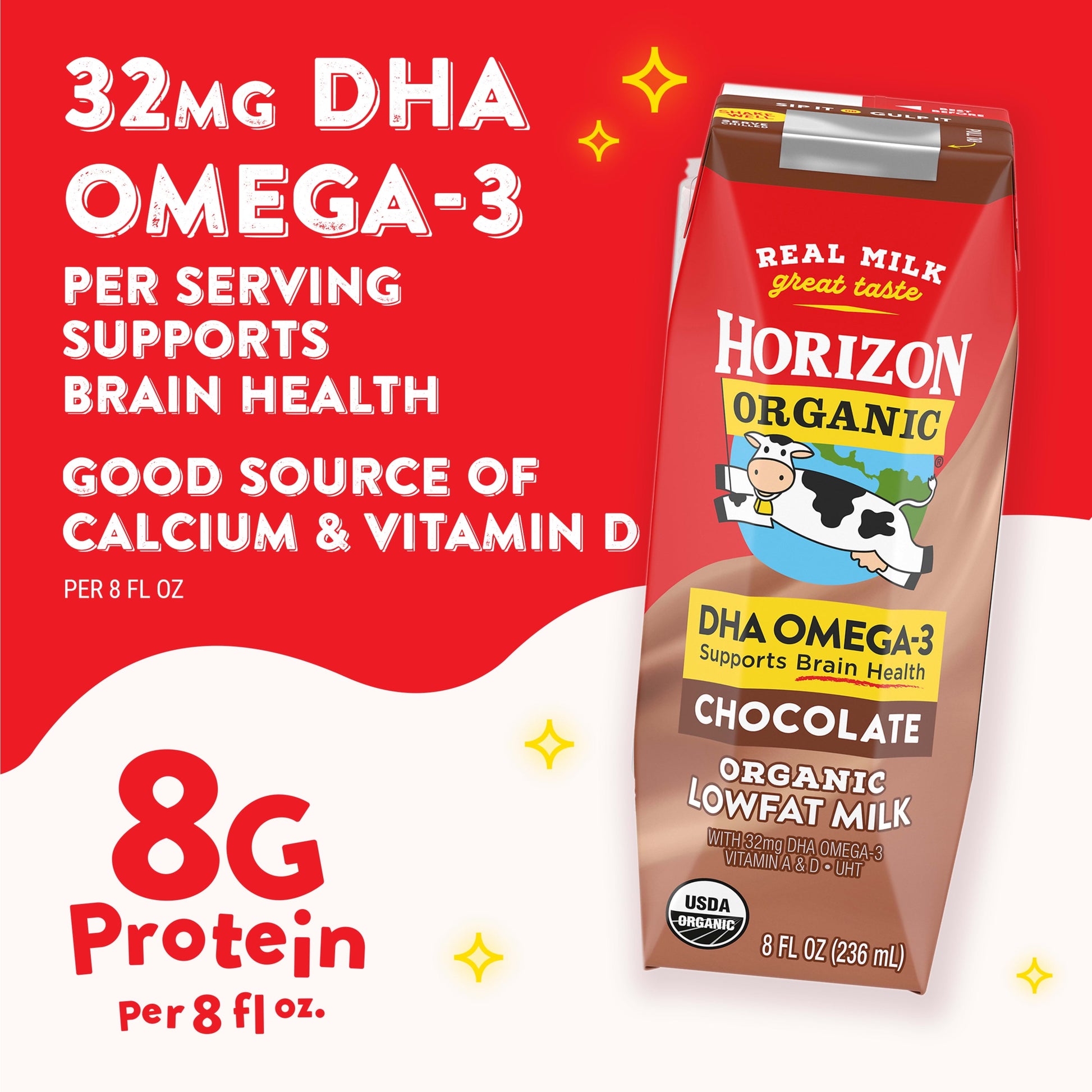 Bring the benefits of DHA to your child’s lunchbox with Horizon Organic UHT 1% lowfat Chocolate Milk Boxes with DHA Omega-3. Each 8-ounce milk box provides 32mg of DHA Omega-3—a valuable nutrient that may help support brain and eye health. Great as a lunchbox stuffer or snack, these single-serve milk boxes offer a wholesome alternative to juice boxes. And thanks to their special packaging, these shelf-stable milk boxes lock in delicious taste without refrigeration.More than 20 years ago, we became the first company to supply organic milk nationwide—and we’ve remained committed to the organic movement ever since. Our USDA Certified Organic products are made with non-GMO ingredients, from cows that are given no antibiotics, no persistent pesticides, and no added hormones.* We strive to do good by our cows, too: they spend much of their time out in the pasture where they feel most at home, and graze on a diet that includes organic grass. It’s all part of our commitment to making better choices for ourselves, our cows, and our planet. *No significant difference has been shown between milk from rbST-treated & non rbST-treated cows.