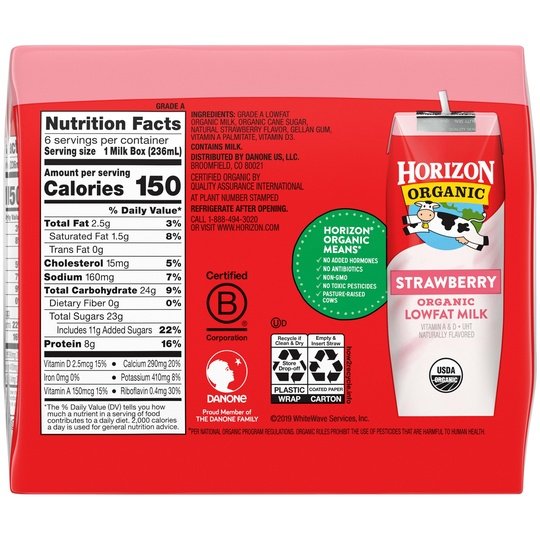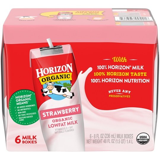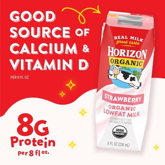 Take the organic goodness of Horizon milk on-the-go with Horizon Organic UHT 1% lowfat Strawberry Milk Boxes. Great as a lunchbox stuffer or snack, these single-serve milk boxes offer a wholesome alternative to juice boxes. Each milk box provides many nutrients, including vitamin A, vitamin D, and 8 grams of protein. And thanks to their special packaging, these shelf-stable milk boxes lock in delicious taste without refrigeration.More than 20 years ago, we became the first company to supply organic milk nationwide—and we’ve remained committed to the organic movement ever since. Our USDA Certified Organic products are made with non-GMO ingredients, from cows that are given no antibiotics, no persistent pesticides, and no added hormones.* We strive to do good by our cows, too: they spend much of their time out in the pasture where they feel most at home, and graze on a diet that includes organic grass. It’s all part of our commitment to making better choices for ourselves, our cows, and our planet. *No significant difference has been shown between milk from rbST-treated & non rbST-treated cows.