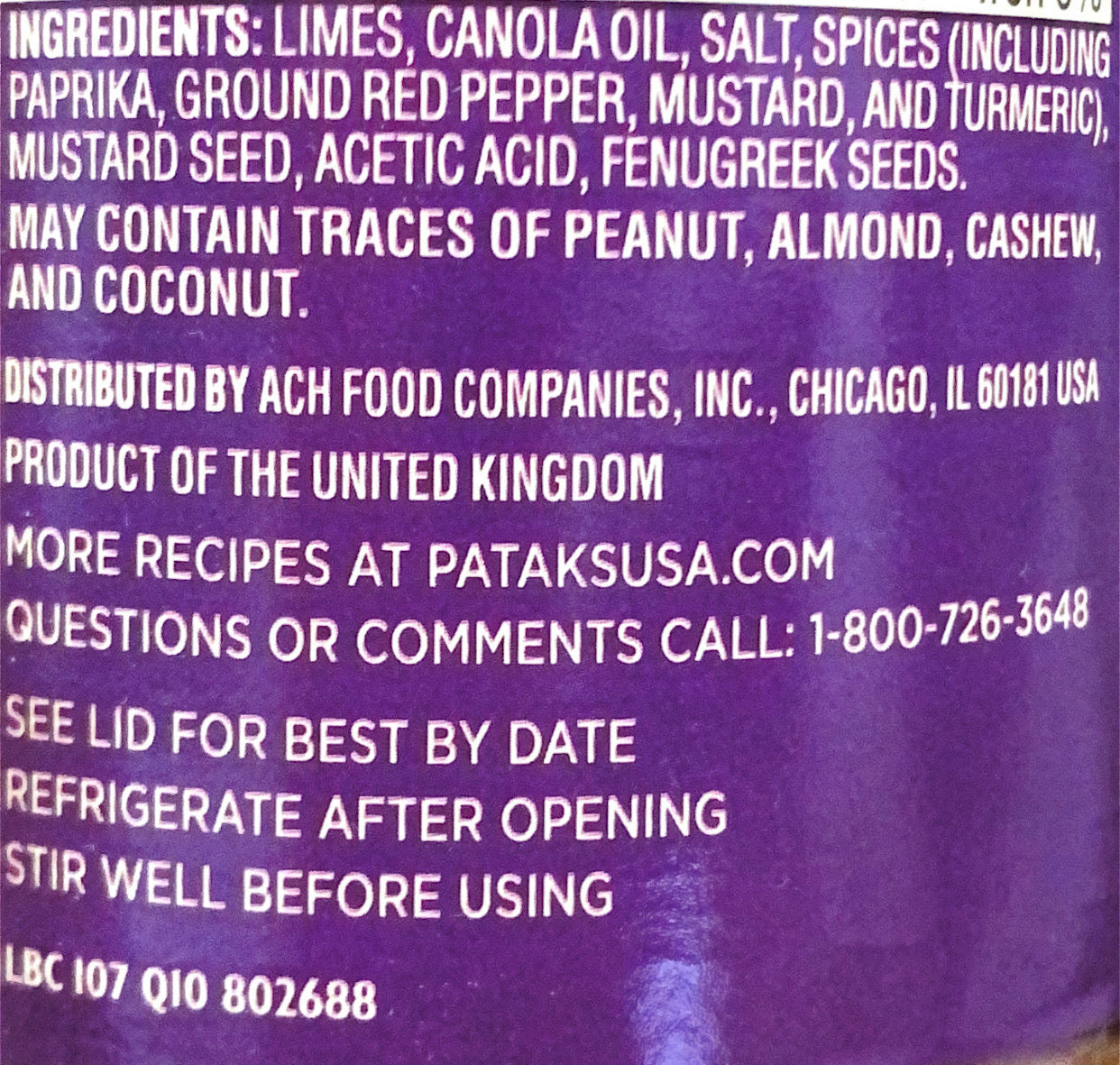 INGREDIENTS: LIME DICES, CANOLA OIL, SALT, SPICES (INCLUDING PAPRIKA, GROUND RED PEPPER, MUSTARD, AND TURMERIC), MUSTARD SEED, ACETIC ACID, FENUGREEK SEEDS.