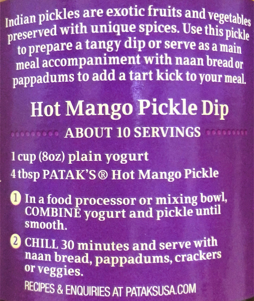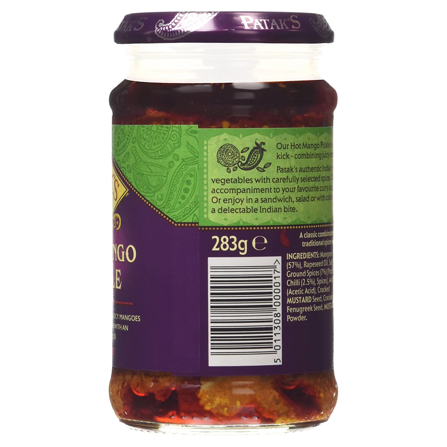 Our Hot Mango Pickle is a traditional Indian pickle with an extra chilli kick - combining juicy mangoes with chillies and traditional spices.Patak's authentic Indian Pickles are tantalising blends of exotic fruits and vegetables with carefully selected spices. Delicious and versatile, our pickles make a tasty accompaniment to your favourite curry and are great with a naan or pappadum. Or enjoy in a sandwich, salad or with cold meats to give an everyday meal a delectable Indian bite. Chilli rating - hot - 3, Gluten free, No artificial preservatives, colours or flavours, Suitable for vegetarians
