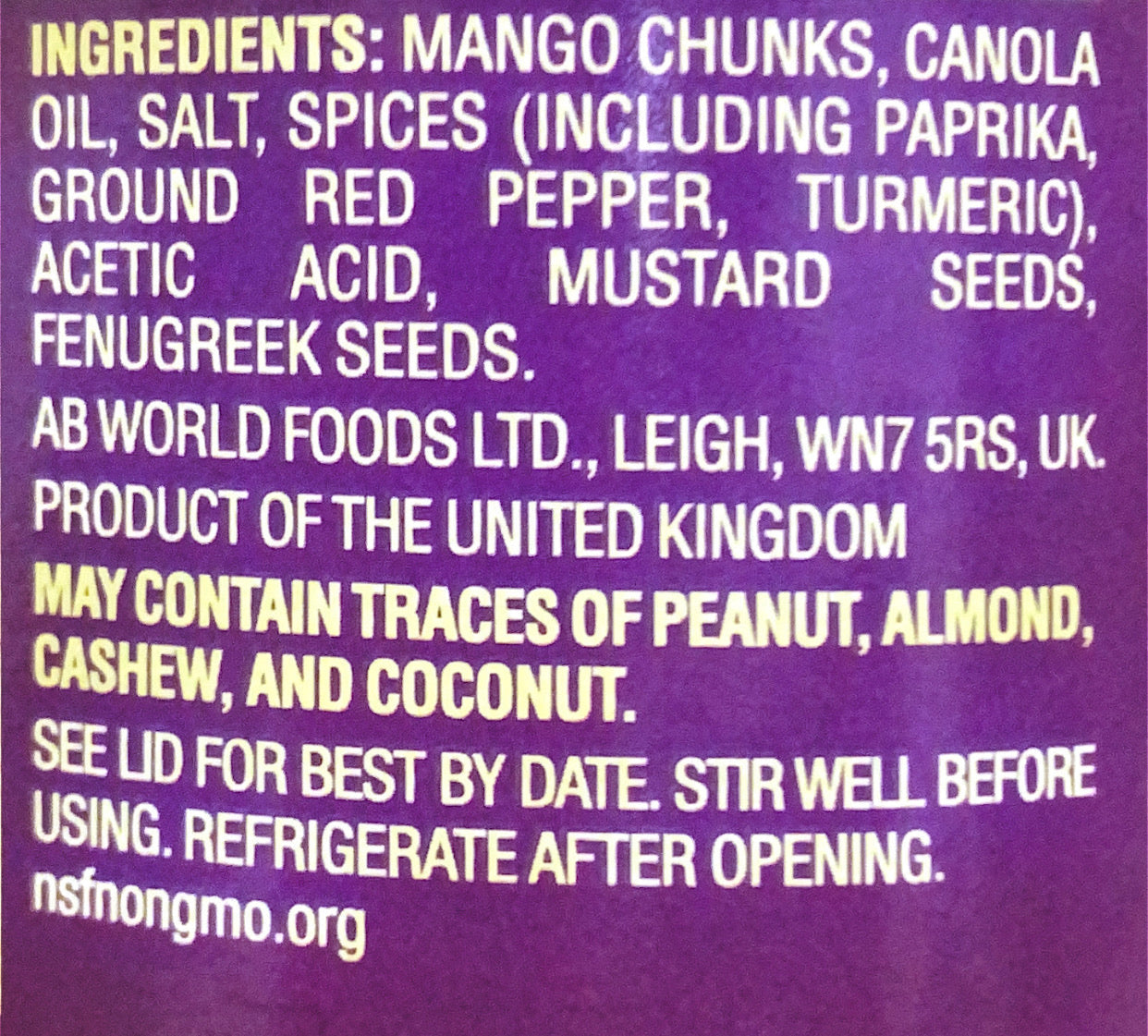 INGREDIENTS: LIME DICES, CANOLA OIL, SALT, SPICES (INCLUDING PAPRIKA, GROUND RED PEPPER, MUSTARD, AND TURMERIC), MUSTARD SEED, ACETIC ACID, FENUGREEK SEEDS.