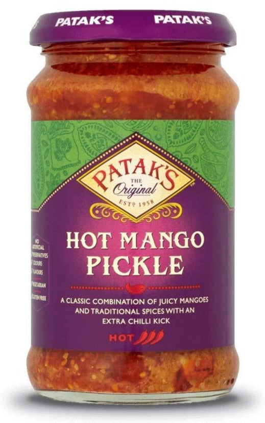 Our Hot Mango Pickle is a traditional Indian pickle with an extra chilli kick - combining juicy mangoes with chillies and traditional spices.Patak's authentic Indian Pickles are tantalising blends of exotic fruits and vegetables with carefully selected spices. Delicious and versatile, our pickles make a tasty accompaniment to your favourite curry and are great with a naan or pappadum. Or enjoy in a sandwich, salad or with cold meats to give an everyday meal a delectable Indian bite. Chilli rating - hot - 3, Gluten free, No artificial preservatives, colours or flavours, Suitable for vegetarians
