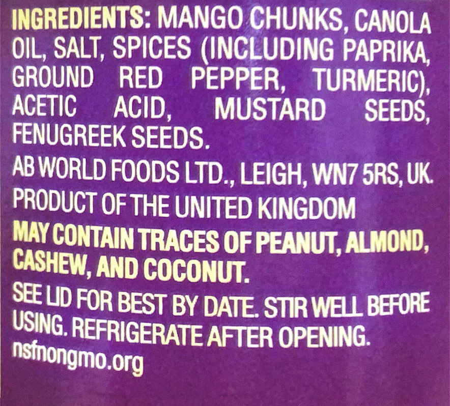 INGREDIENTS: LIME DICES, CANOLA OIL, SALT, SPICES (INCLUDING PAPRIKA, GROUND RED PEPPER, MUSTARD, AND TURMERIC), MUSTARD SEED, ACETIC ACID, FENUGREEK SEEDS.
