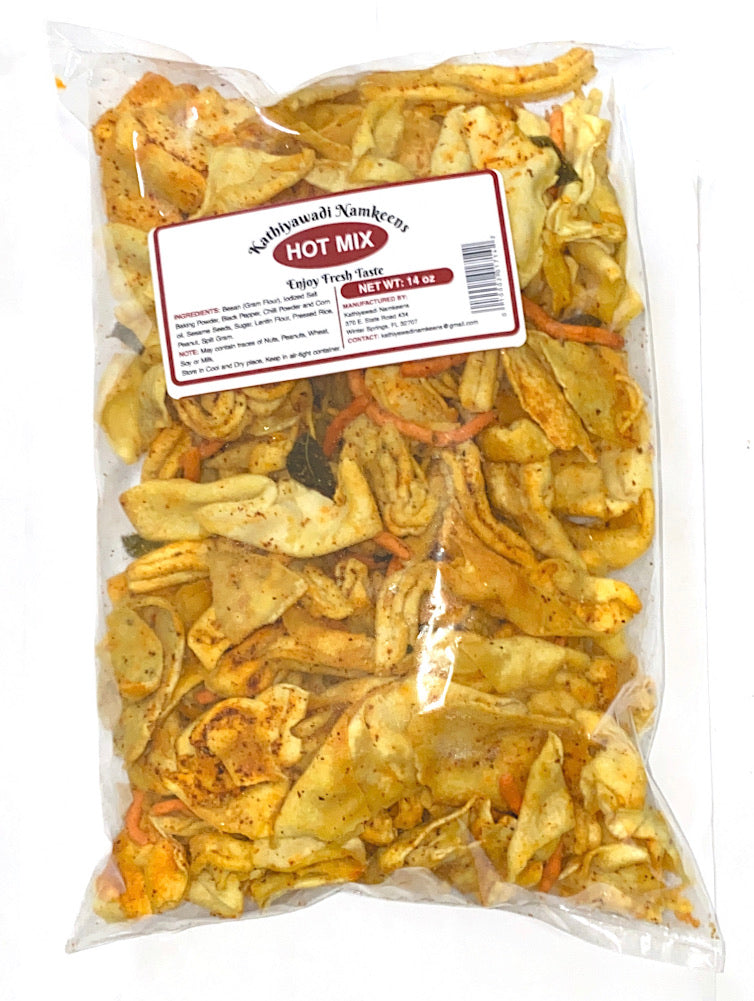 Kathiyawadi Namkeens Hot Mix has been around for decades, and continues to be the snack mix of choice of Indians across the USA. This Indian "trail mix" is a combination of gram flour strings, gram flour nuggets, peanuts, puffed gram flour balls, fried lentils, rice flakes, puffed rice and a plethora of tangy spices.