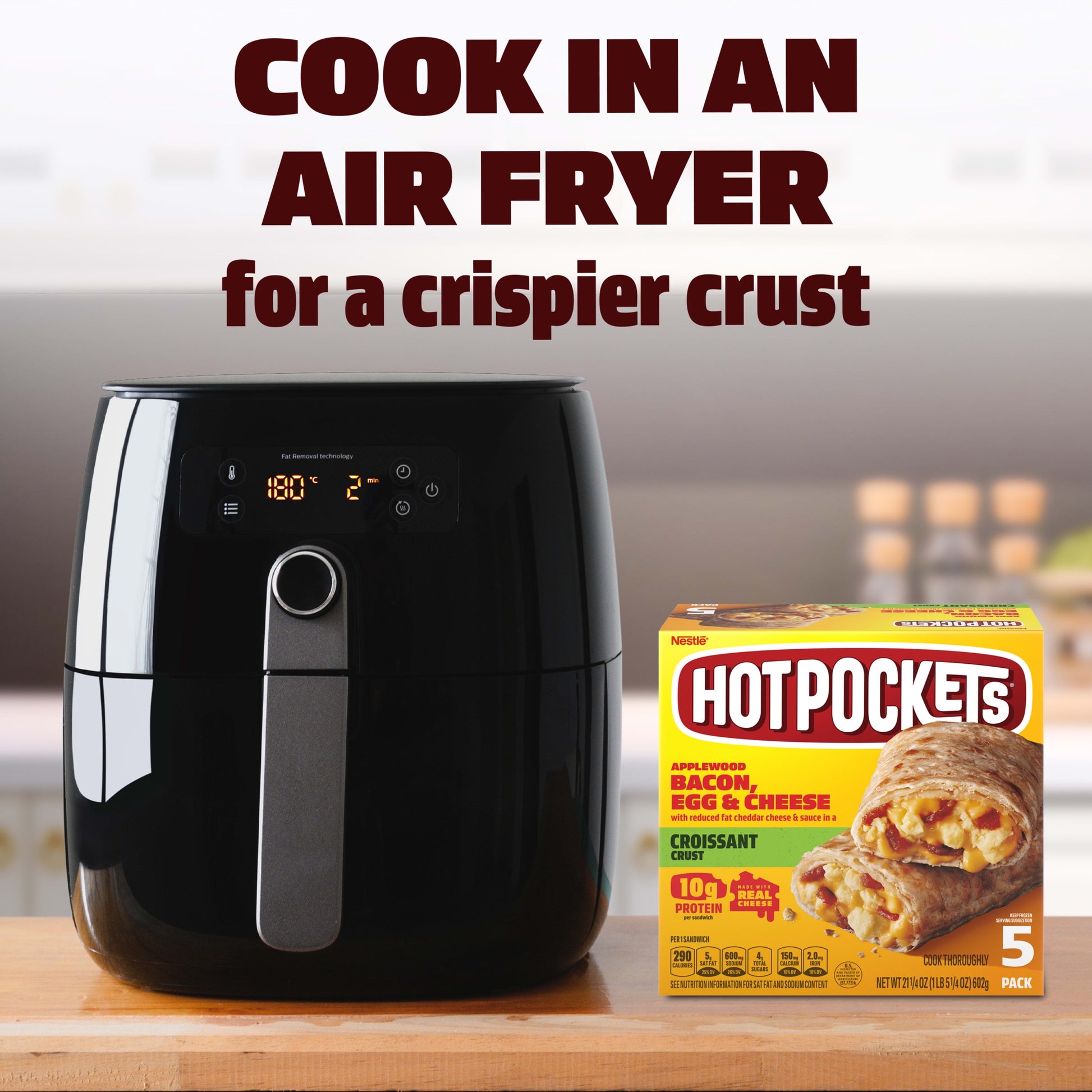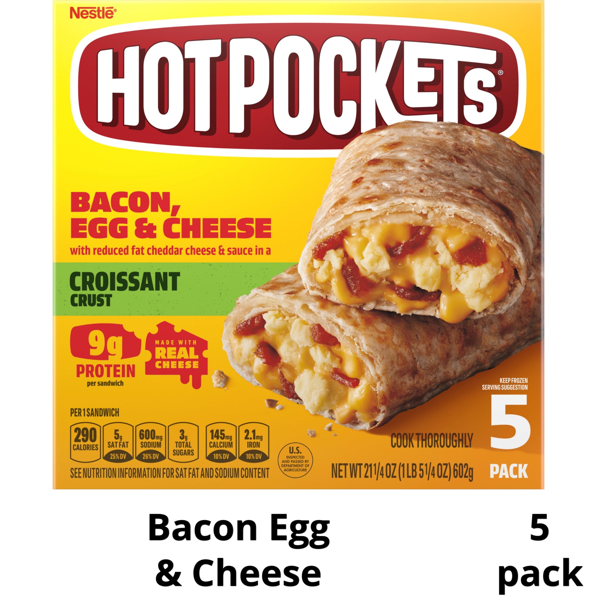 Make breakfast time anytime with Hot Pockets Applewood Bacon, Egg and Cheese Croissant Crust Frozen Breakfast Sandwiches. Each scrumptious croissant sandwich is loaded with eggs, bacon, and reduced-fat cheddar cheese and sauce all wrapped inside a flaky croissant crust. Breakfast Hot Pockets are made with real cheese, so you can enjoy your breakfast on the go. These croissant sandwiches aren’t just an ideal hot breakfast, a Hot Pockets bacon and eggs frozen sandwich is perfect for any occasion, such as on-the-go comfort food or an easy meal. Whether it’s part of a quick lunch or snack, each sandwich is a good source of protein with 10 grams of protein per serving. Ready after 2 minutes in the microwave and 2 minutes to cool, this microwave food makes a hot breakfast or on the go snack a snap to prepare, even in the oven or air fryer. No matter how you prepare them, Hot Pockets Applewood Bacon, Egg and Cheese Croissant Crust Frozen Breakfast Sandwiches are hot and delicious every time. Keep Hot Pockets frozen snacks in the freezer until you're ready to cook and eat. Try Hot Pockets Core and Big & Bold frozen snacks products to amp up your snack time with titanic flavor. Each Package Contains 5 Regular Sandwiches, 22.5 Total Ounces
