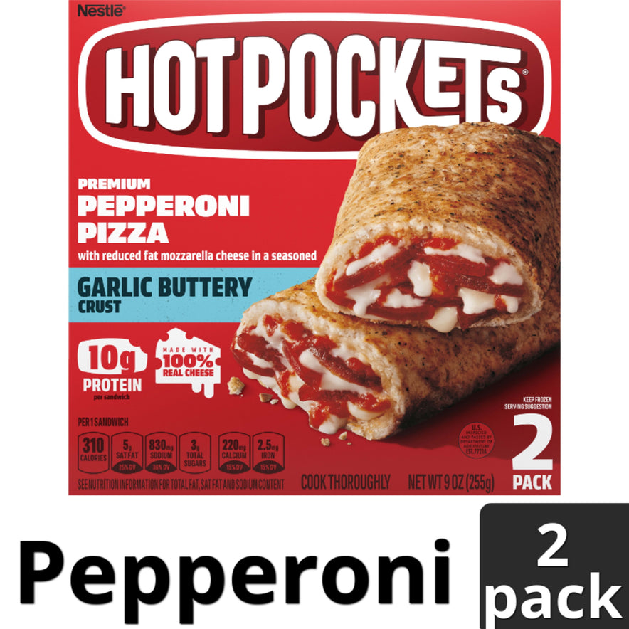 Dive into the cheesy, saucy and savory world of snacking with Hot Pockets Pepperoni Pizza Regular Frozen Snacks. Featuring pepperoni made with pork and beef, along with reduced fat mozzarella cheese inside a deliciously seasoned garlic buttery crust, these indulgent pepperoni pizza pockets aren't your average pizza rolls or frozen lunch snack. Hot Pockets pepperoni pizza frozen sandwiches are hunger's worst nightmare, delivering the bold flavors of pepperoni and cheese pizza in a hearty microwaveable snack. Great for gaming all night, a quick dinner after work or a quick bite before heading out the door, Hot Pockets Pepperoni Pizza snacks are perfect for any regular occasion. Each frozen sandwich is a good source of protein with 10 grams of protein per sandwich. Cook this microwave food for 2 minutes on high and let cool for 2 minutes for an on the go snack. Bake for 27 minutes at 350 degrees or air fry at 360 degrees for 16 minutes. Hot Pockets Pepperoni Pizza snacks are hot and delicious every time. Keep Hot Pockets Pepperoni Pizza Frozen Snacks frozen until ready to cook and eat. Try Hot Pockets Breakfast, Big & Bold and Deliwich frozen snacks to amp up your snack time with titanic flavor.