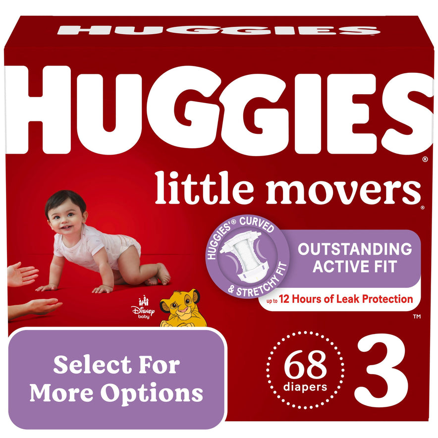Huggies Little Movers Baby Diapers are designed to stay in place through active play! These disposable baby diapers are designed for worry-free running, jumping and playing without any leaks or disruptions. Each Little Movers diaper is up to 100% leak-free (even for blowouts!) and offers up to 12 hours of comfortable protection to keep your baby active and clean. Our diapers feature a curved and stretchy fit and a flexible, yet secure waistband designed to prevent leaks and help keep your baby comfortable while on the move. Double Grip Strips provide a secure, flexible fit and the diaper is designed to help eliminate gaps at the legs and waist to protect against leaks and irritation. These Huggies diapers are extra soft and contoured around the legs to help provide red-mark free, gentle protection. Little Movers are made with a fast-absorbing DryTouch Liner and our baby diaper locks away 99% of wetness to help keep skin dry. Plus, a wetness indicator easily lets you know when your baby is ready for a diaper change. Little Movers Diapers are available in size 3 (16-28 lbs), size 4 (22-37 lbs), size 5 (27+ lbs), size 6 (35+ lbs) and size 7 (41+ lbs).