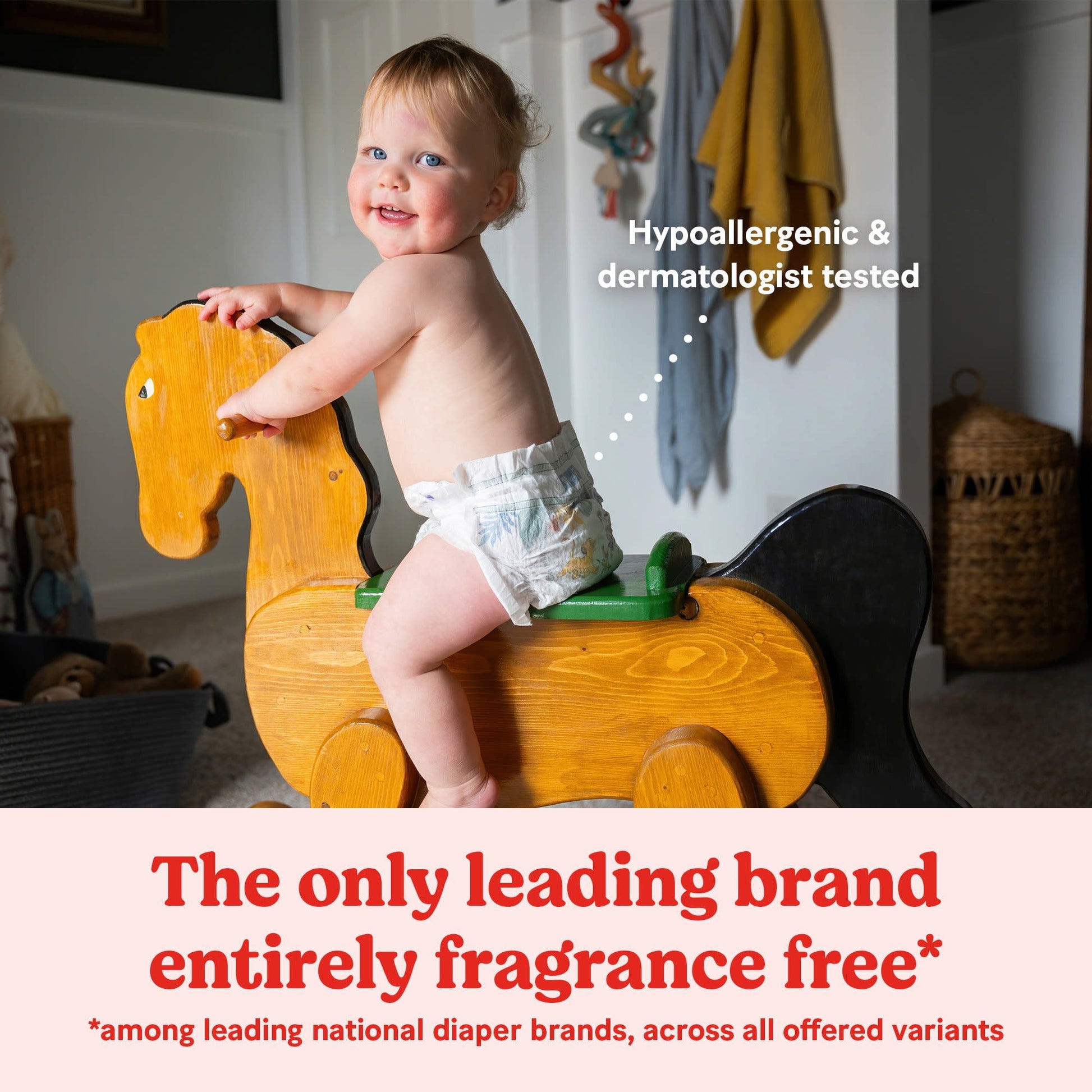 The Only Leading Brand Entirely Fragrance Free**: All Huggies diapers are free of fragrance and elemental chlorine and made without parabens or natural rubber latex (**among leading national diaper brands, across all offered variants)