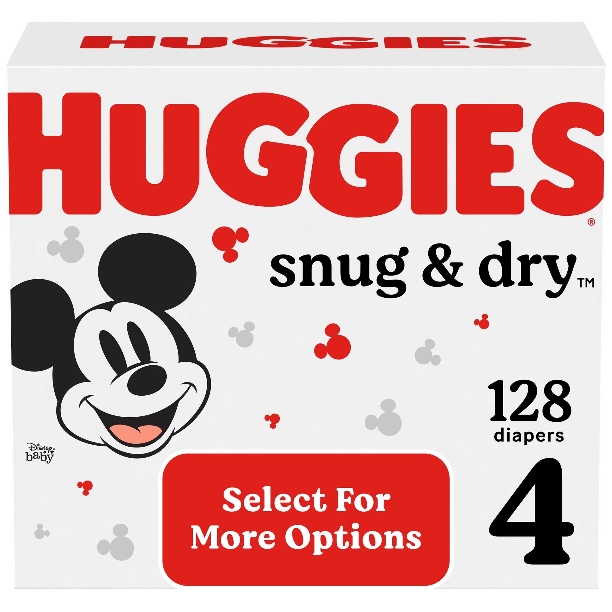 Help give your baby healthy, huggable skin with Huggies Snug & Dry Baby Diapers. These disposable baby diapers offer up to 12 hours of long-lasting protection, day or night, thanks to the Leak Lock Protection. They're also made with Triple Layer Protection that absorbs wetness in seconds. Plus, each diaper has a stretchy waistband for added comfort and curves at every layer to fit your baby’s delicate skin. Snug & Dry is hypoallergenic, contains no harsh ingredients and is free of fragrances, parabens, elemental chlorine and natural rubber latex. A wetness indicator changes from yellow to blue when in contact with moisture, so you always know when your baby is ready for a diaper change. Featuring fun Disney Mickey Mouse designs as cute as your baby, Snug & Dry Diapers are available in sizes 1 (8-14 lbs), 2 (12-18 lbs), 3 (16-28 lbs), 4 (22-37 lbs), 5 (27+ lbs), 6 (35+ lbs) and size 7 (41+ lbs). (*See the Huggies website for details. Expires 12/31/23)