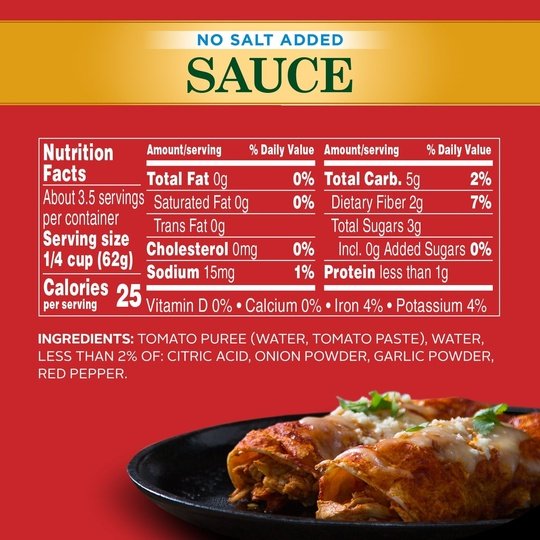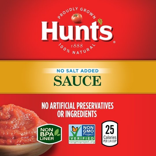 Enjoy the smooth, rich flavor of the Hunt's you love without the added sodium with Hunt's Tomato Sauce, No Salt Added. Hunt's low-sodium sauce brings out the home-cooked flavor in family-favorite meals like lasagna, meatloaf, chili, stews, pastas, and casseroles. No compromise, Hunt's Tomato Sauce is 100% natural, with no artificial preservatives. Hunt's doesn't use sugar, corn syrup, or other sweeteners in its canned tomato sauces. Contains 8 oz of sauce; 20 calories per serving. Hunt's tomatoes are picked at the peak of ripeness, because great tasting meals start with great ingredients.