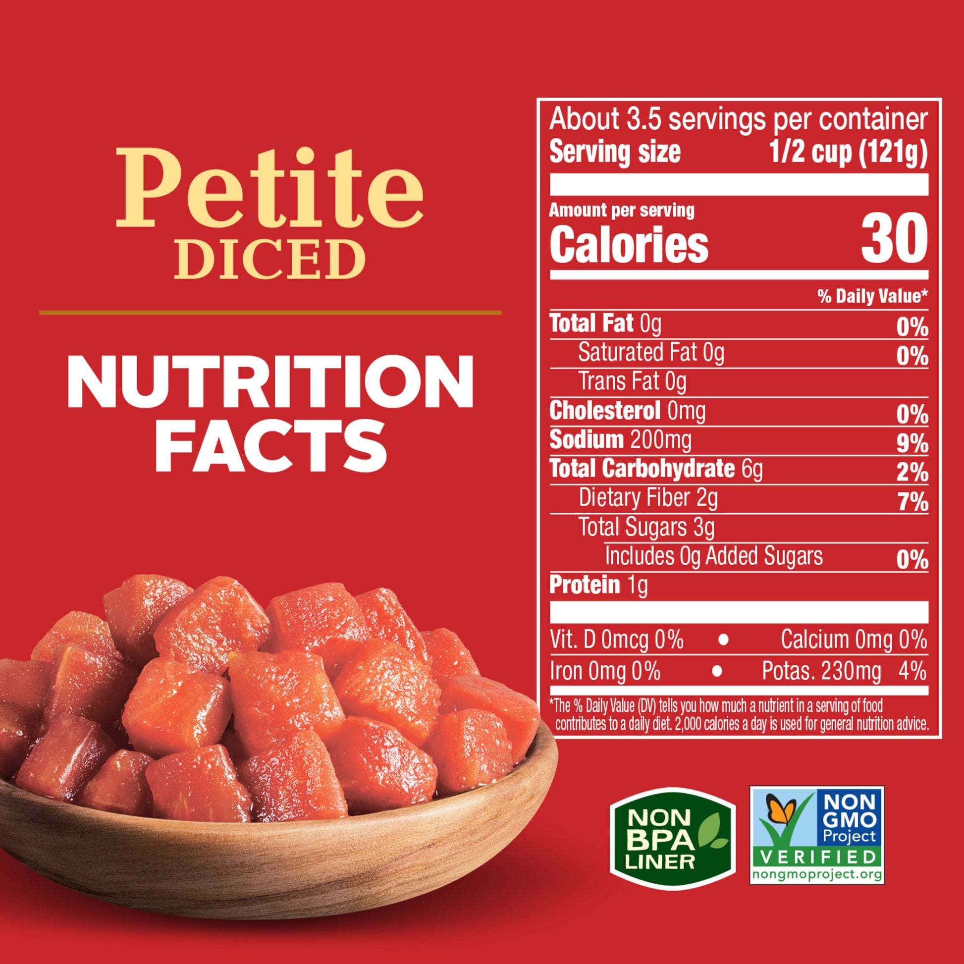 Contains 14.5 oz of canned diced tomatoes; roughly 3.5 servings per container; 30 calories per serving